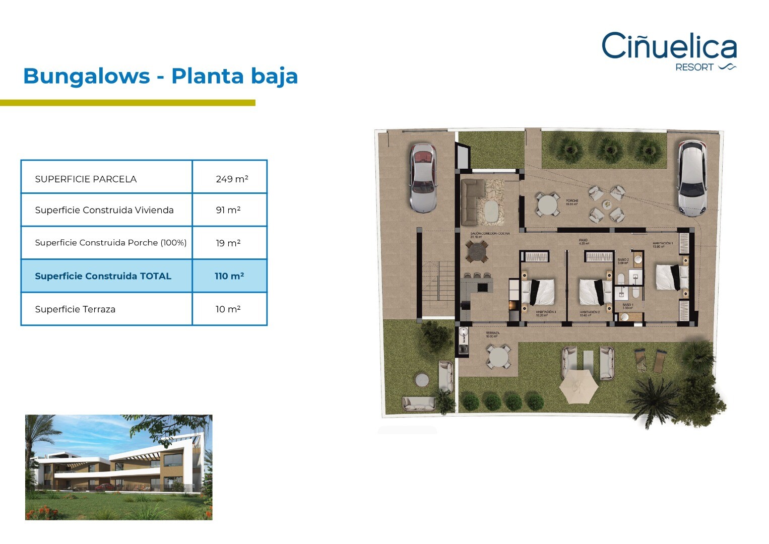 „La Cinuelica Resort“ yra rezidencija, kurią sudaro 4 daugiabučiai, kuriuose iš viso yra 32 2 miegamųjų apartamentai, 32 3 miegamųjų apartamentai ir 14 vasarnamių su 3 miegamaisiais. Butuose yra požeminė parkavimo vieta ir sandėliukas, virtuvės buitinė technika (šaldytuvo-šaldiklio derinys, keraminė kaitlentė, orkaitė, mikrobangų krosnelė, indaplov...ė, skalbimo mašina ir gartraukis), elektrinės žaliuzės, aeroterminio vandens boileris, išankstinis oro kondicionierius. ortakiai ir stogo soliariumams išankstinis lauko virtuvės ir sūkurinės vonios įrengimas. Bendrosiose patalpose yra sutvarkyti sodai su 3 baseinais ir 2 šildomomis sūkurinėmis voniomis, lauko treniruoklių zona ir žaidimų aikštelė. Rezidencija yra 1000 m nuo Punta Prima paplūdimio ir 500 m nuo prekybos centrų, kuriuose yra prekybos centrai, barai, restoranai, bankomatai, parduotuvės ir kt.