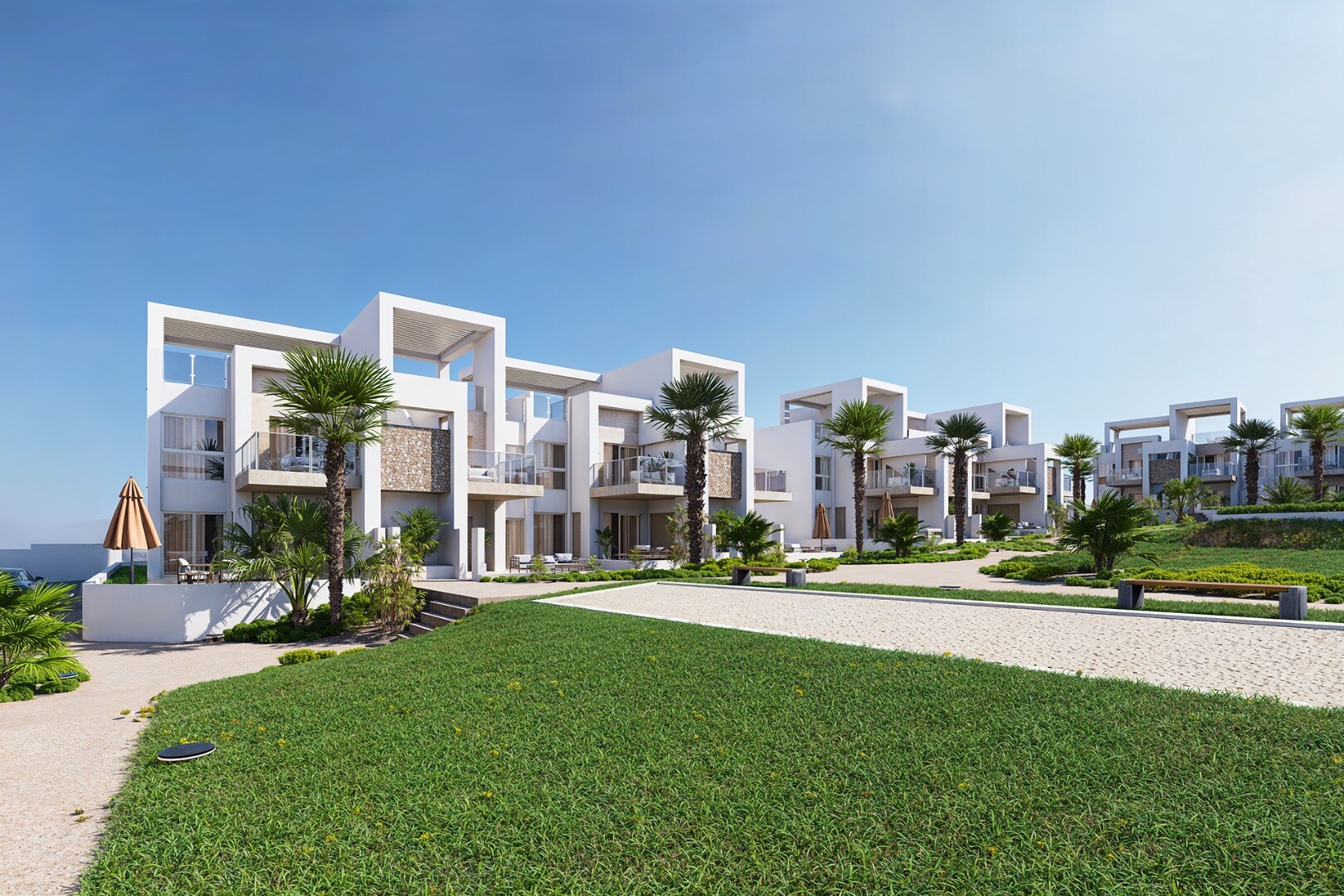 Komplekse yra puikios bendros teritorijos, kuriose yra bendras baseinas, sodai ir vaikų žaidimų aikštelė, idealiai tinkančios šeimoms arba tiems, kurie ieško ramybės ir tylos neatsisakydami netoliese esančių paslaugų.