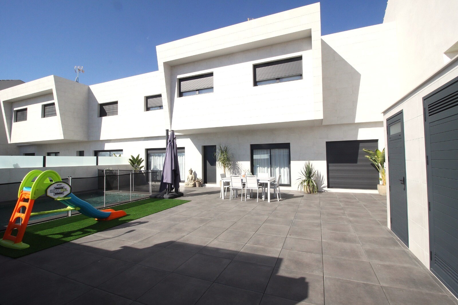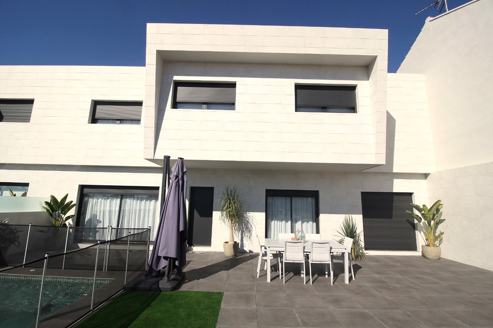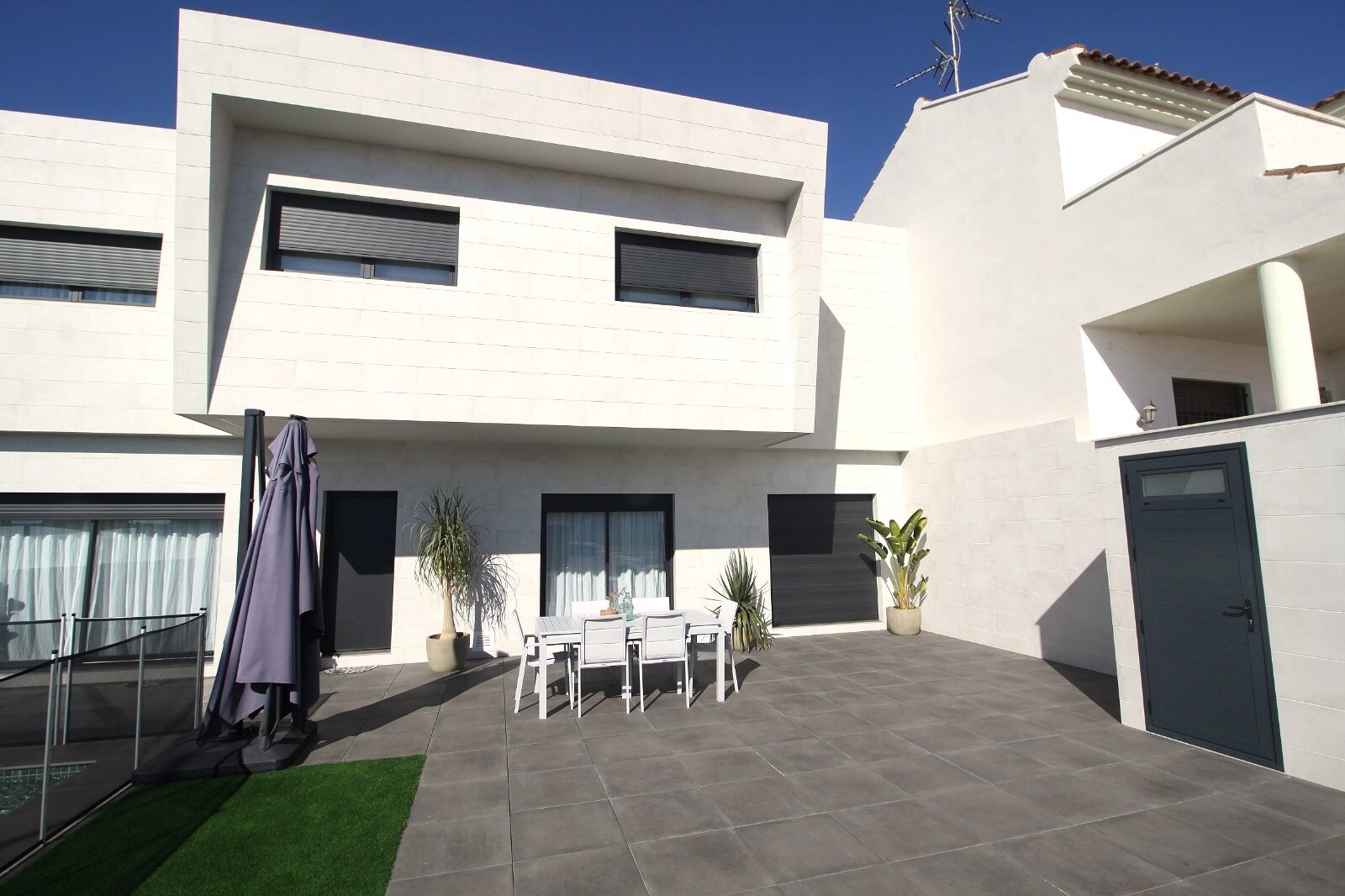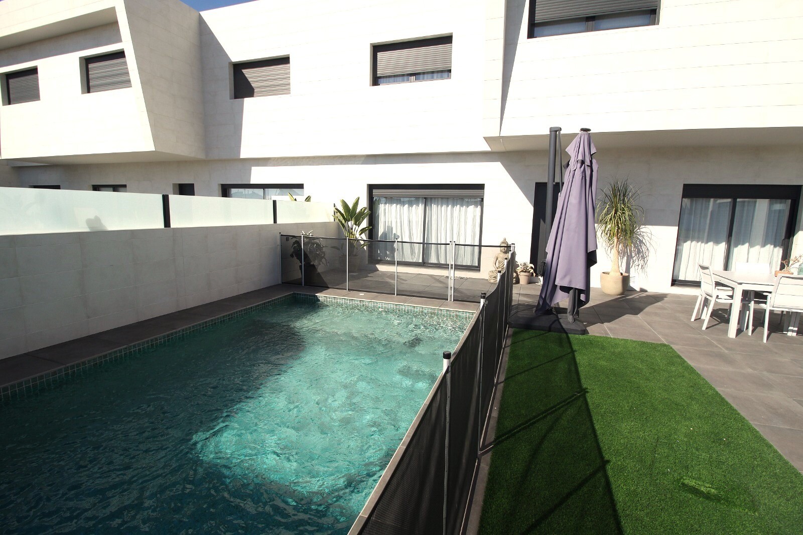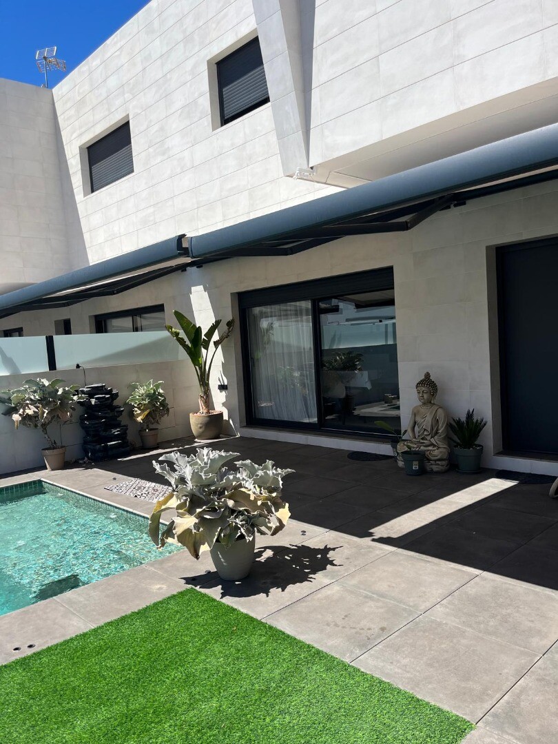 Neseniai perparduotas sublokuotas namas su terasa San Pedro del Pinatar su 4 miegamaisiais ir 2 vonios kambariais bei lauko tualetu prie 6x4m baseino su įmontuota sūkurine vonia. Namas yra 3 km nuo Viduržemio jūros ir 500 m nuo centro. Namas pilnai įrengtas su šildomomis grindimis, oro kondicionieriumi ir virtuvės buitine technika. Korveros ir Alik...antės oro uostus galima pasiekti atitinkamai per 30 ir 50 minučių.