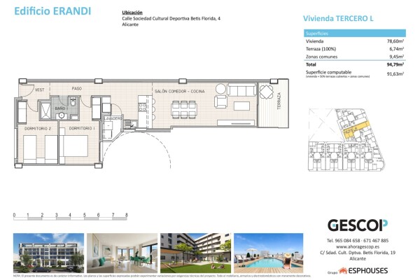 Šis naujos statybos butas yra trečiame ERANDI pastato aukšte, La Florida rajone Alikantėje – įsitvirtinusiame gyvenamajame rajone, kuris pasižymi ramybe ir puikiu susisiekimu su miesto centru. Bendras statomas plotas siekia 91 m², išdėstytas į du miegamuosius, vieną pilnai įrengtą vonios kambarį ir erdvią svetainę su valgomuoju bei atvira virtuve, ...suprojektuotą moderniu ir funkcionaliu stiliumi, maksimaliai išnaudojant natūralią šviesą.