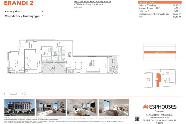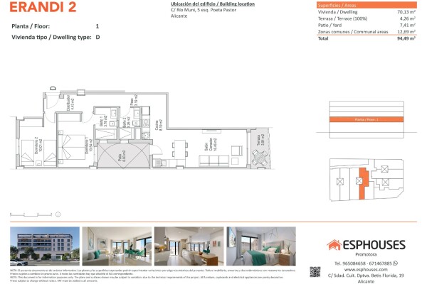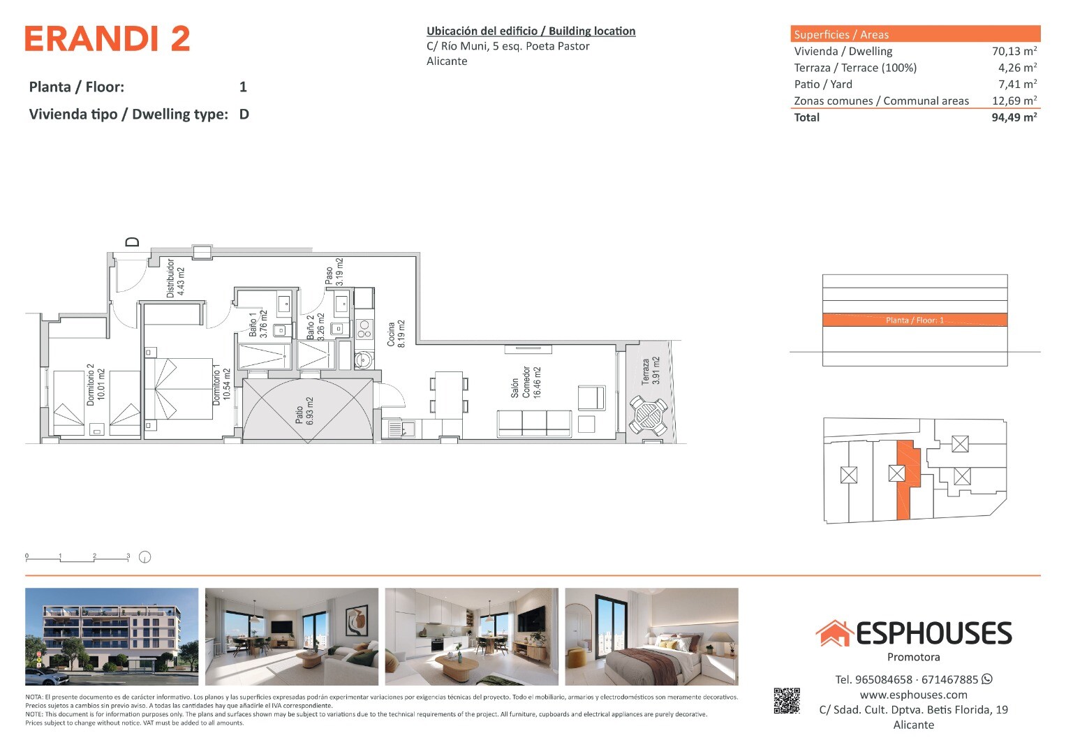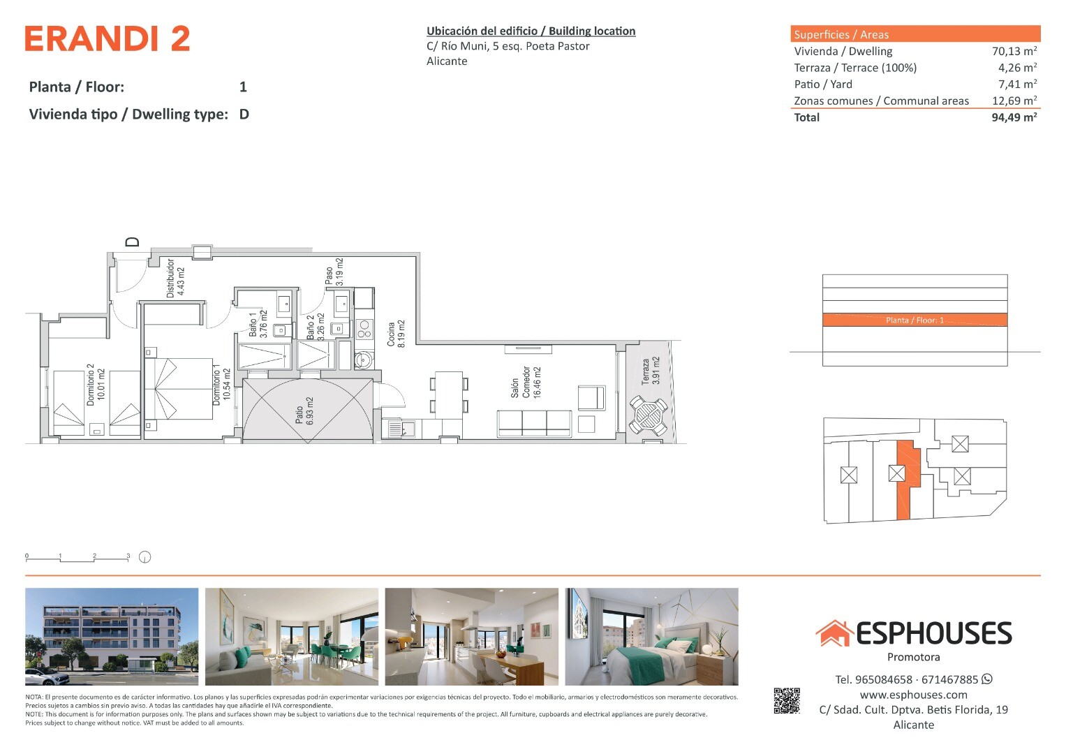 Šis naujos statybos butas yra pirmame ERANDI 2 pastato aukšte ir siūlo 70,13 m² bendro ploto. Jo modernus ir funkcionalus dizainas apima 4,26 m² terasą ir 7,41 m² kiemelį – puiki vieta mėgautis Viduržemio jūros klimatu.
