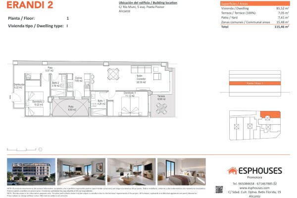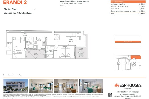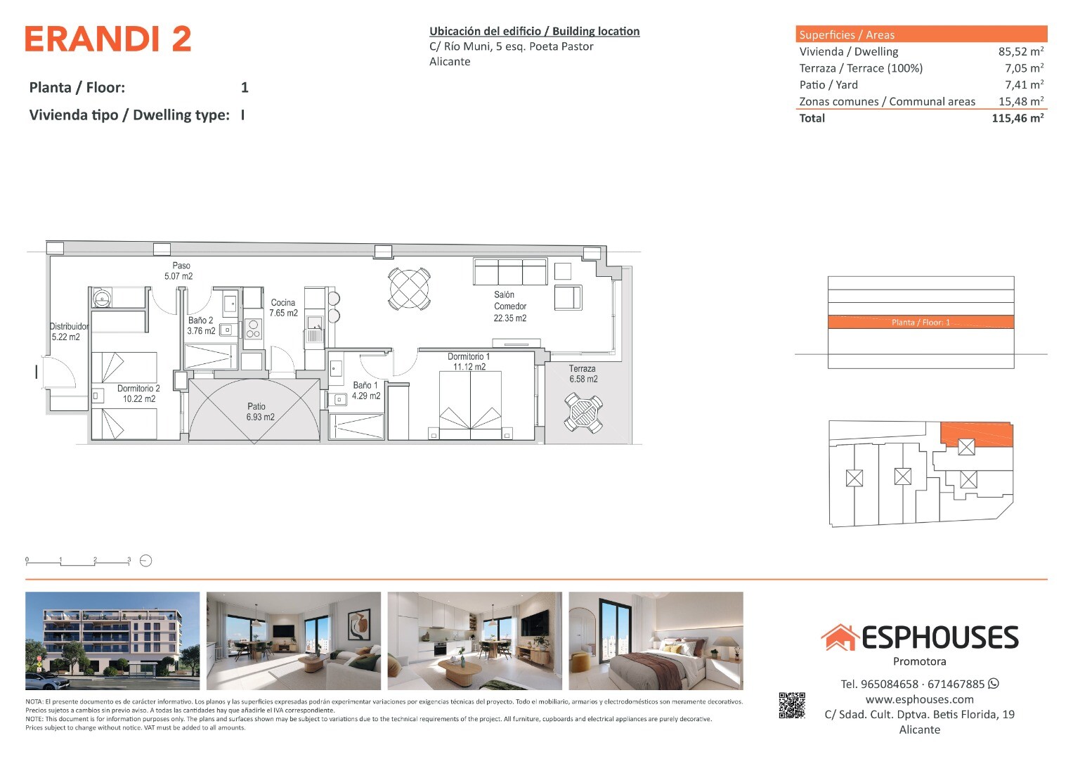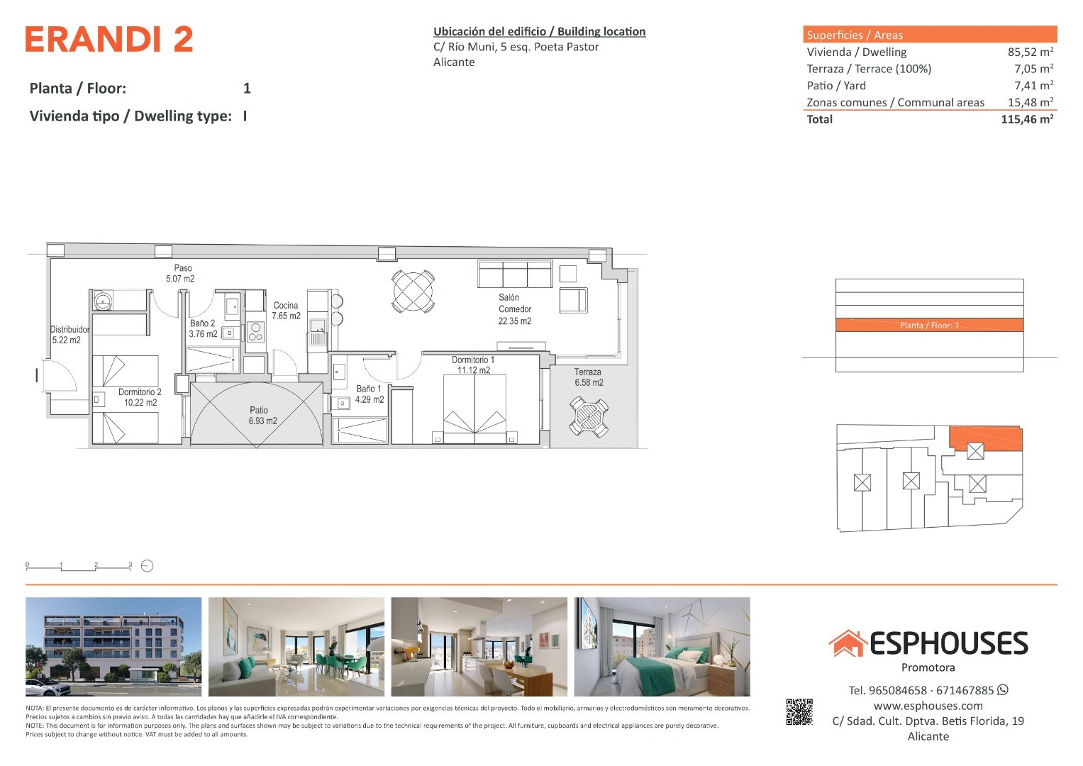 Šis naujos statybos butas yra pirmame ERANDI 2 pastato aukšte ir pasižymi moderniu dizainu, puikiu išplanavimu bei išorinėmis erdvėmis, pritaikytomis mėgautis Viduržemio jūros klimatu. Bendras plotas siekia 85,52 m². Jame yra du miegamieji su sieninėmis spintomis, du vonios kambariai, svetainė su valgomojo zona ir atvira virtuve, pietinė terasa (7,...05 m²) ir privatus kiemas (7,41 m²).