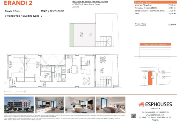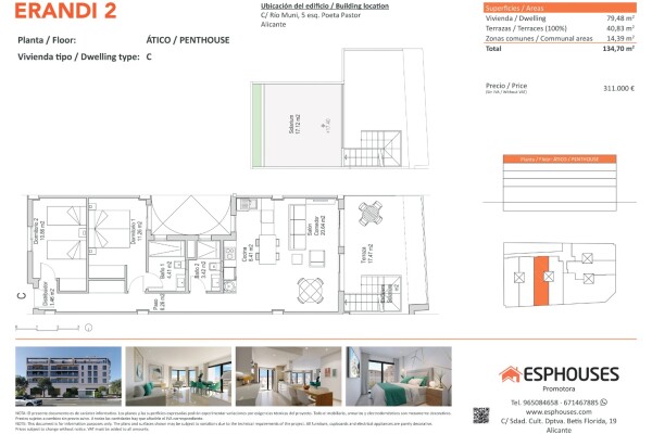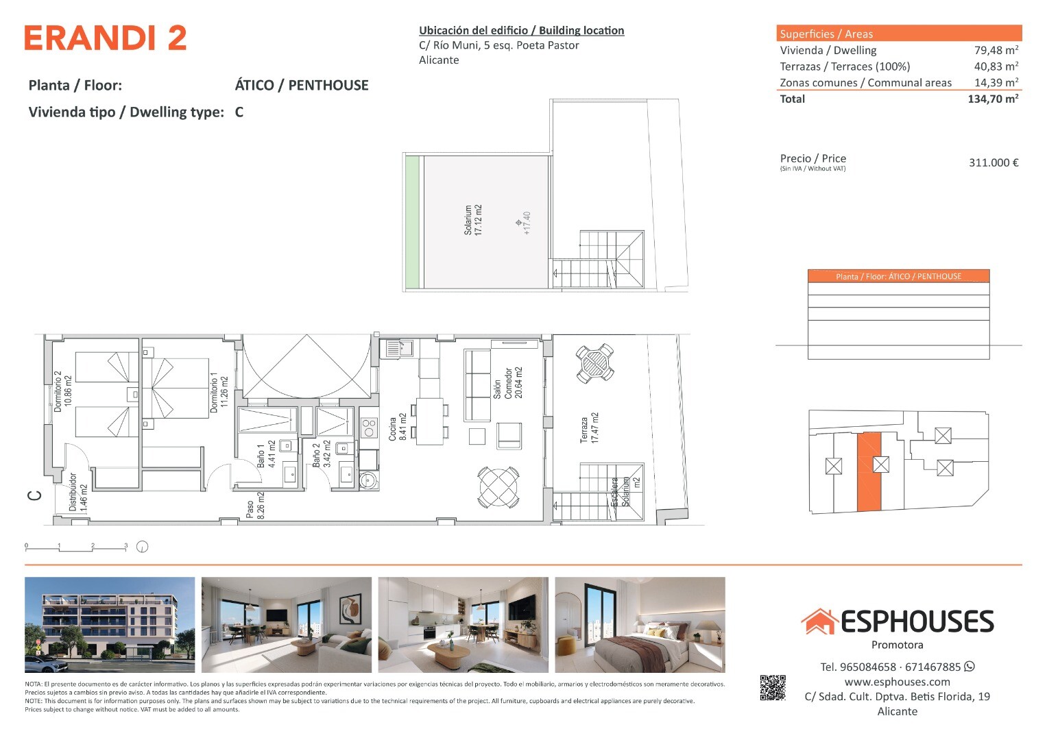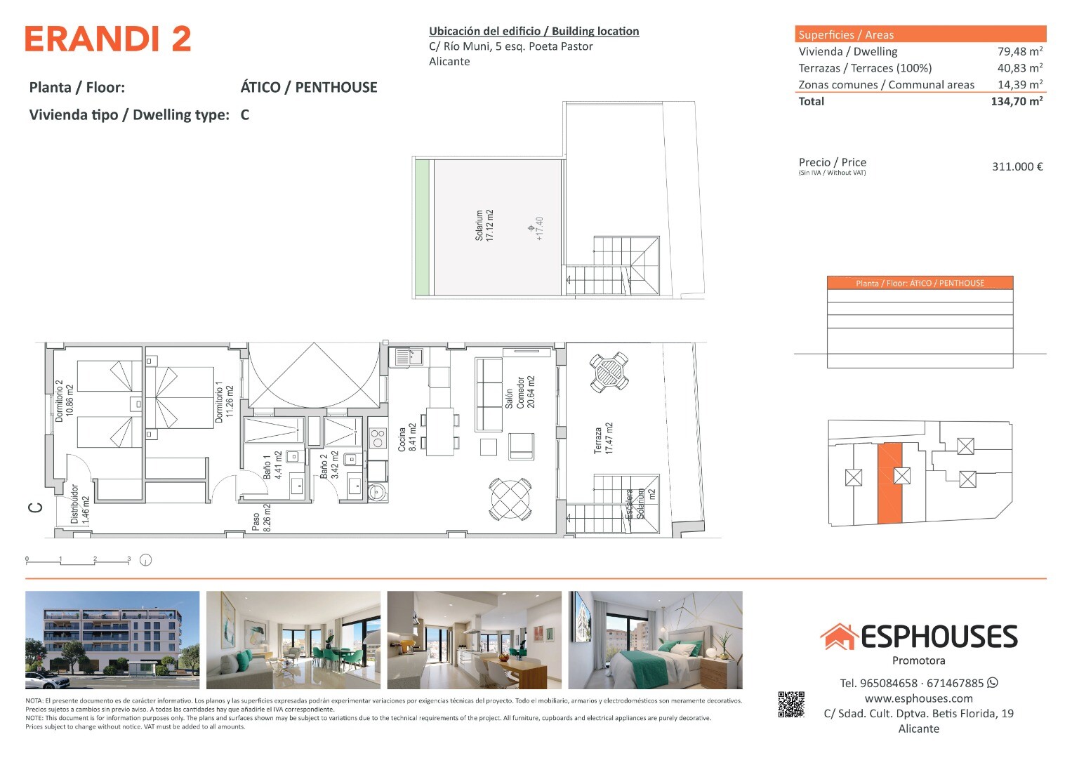 Šis šviesus penthausas yra ketvirtame ERANDI 2 pastato aukšte — La Florida rajone, gerai susisiekiančioje ir prestižinėje Alikantės dalyje. Buto plotas – 79,48 m², jame yra du miegamieji su įmontuotomis spintomis, du vonios kambariai ir erdvus svetainės-valgomojo su modernia atvira virtuve.