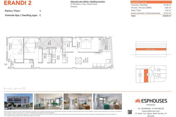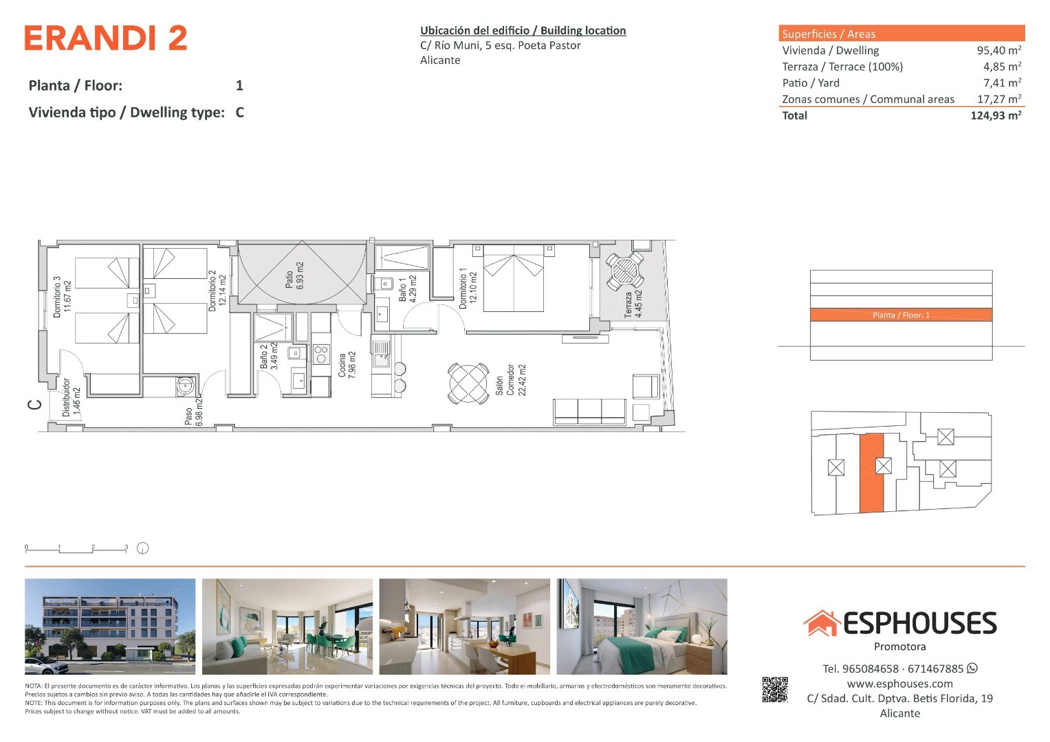 Šis naujos statybos butas yra pirmame „ERANDI 2“ pastato aukšte ir siūlo 95,40 m² bendro ploto. Jo išplanavimas sujungia komfortą, funkcionalumą ir išorines erdves – 4,85 m² terasa ir 7,41 m² kiemelis puikiai tinka mėgautis Viduržemio jūros klimatu.