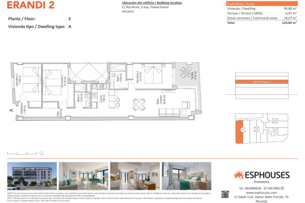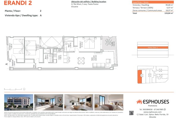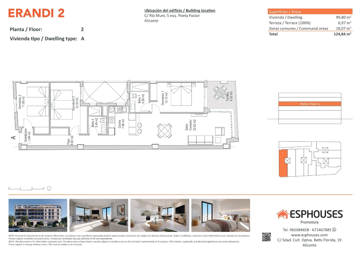Atraskite šį išskirtinį naujos statybos butą, esantį antrame ERANDI 2 pastato aukšte, žymiajame La Floridos rajone – vienoje iš gyviausių ir geriausiai susisiekiančių Alikantės vietovių. Buto bendras plotas siekia 99,80 m², jame yra trys miegamieji su įmontuotomis spintomis, du vonios kambariai, erdvi svetainė su atvira virtuve ir jauki 6,97 m² ter...asa su vakarine orientacija – puikiai tinka mėgautis popietine saule.