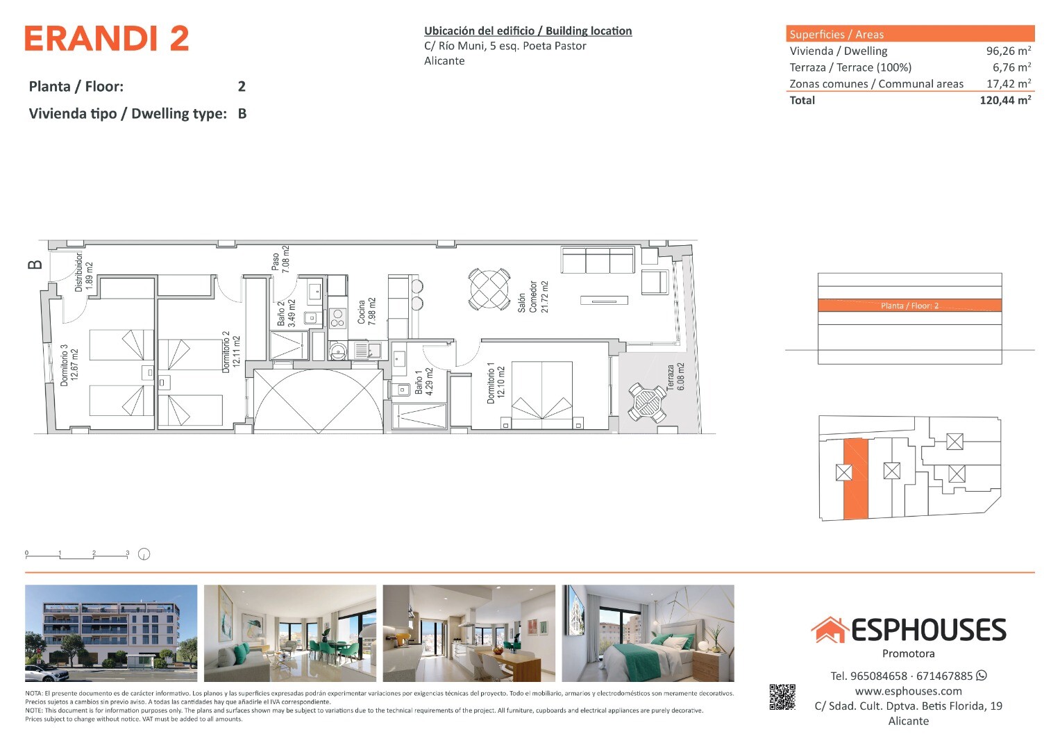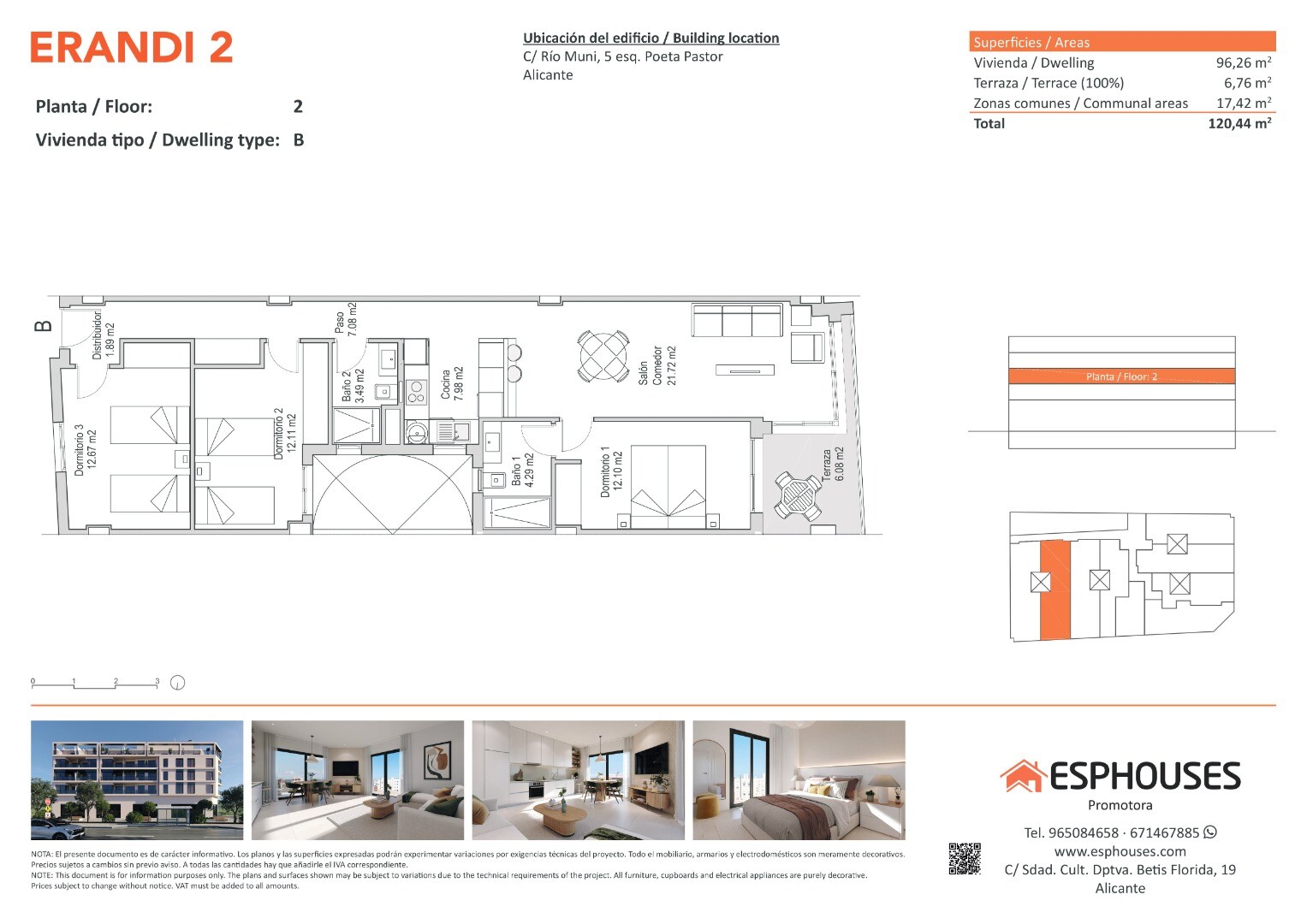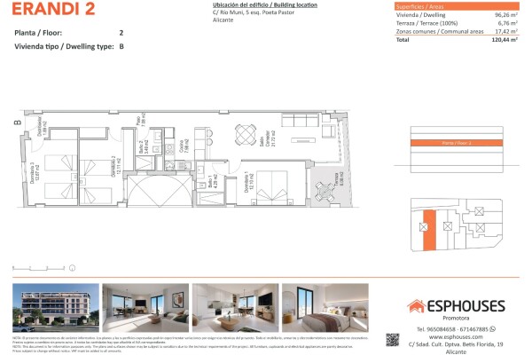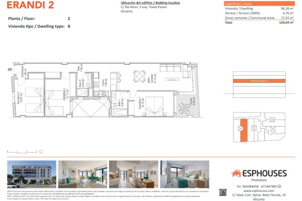 Šis modernus naujos statybos butas yra antrame ERANDI 2 pastato aukšte, La Floridos rajone – viename iš geriausiai išvystytų ir gerai susisiekiančių Alikantės rajonų. Bendras plotas – 96,26 m². Būste yra trys miegamieji su sieninėmis spintomis, du vonios kambariai, svetainė su virtuve ir 6,76 m² terasa į vakarus – puiki vieta vakarinei šviesai.