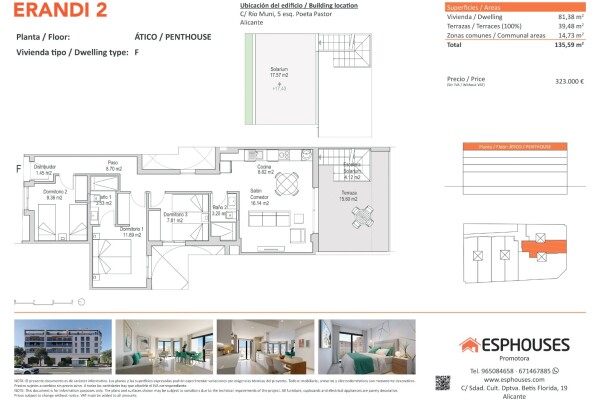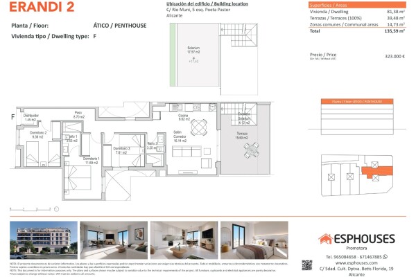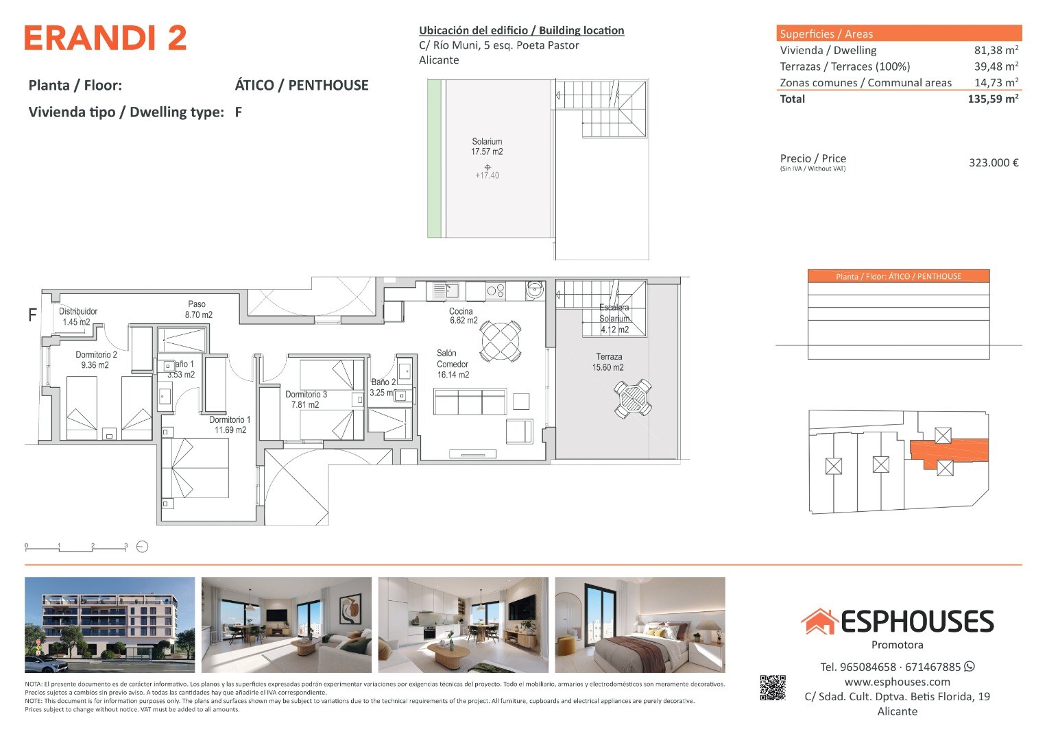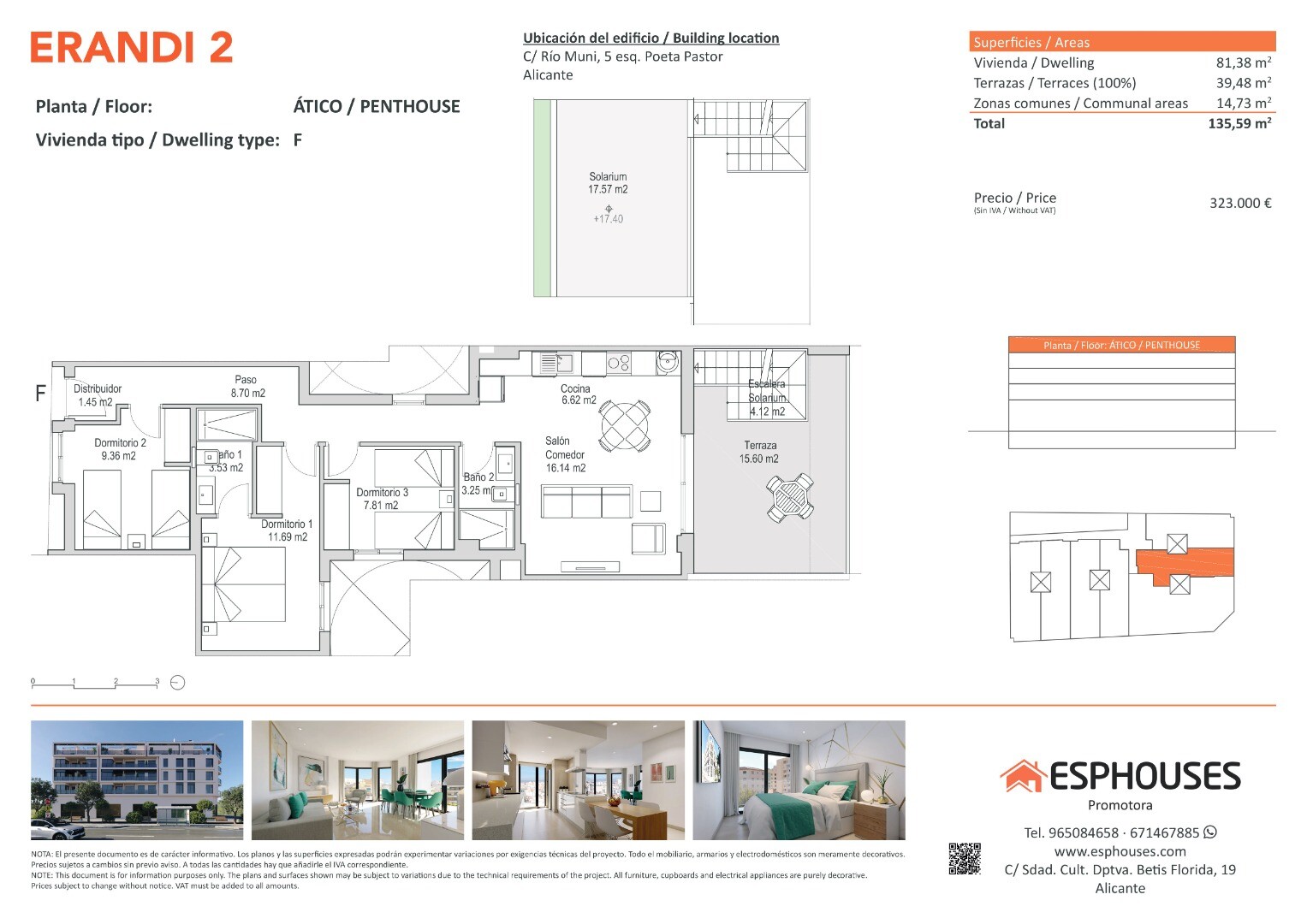 Šis naujos statybos penthauzas yra ketvirtame ERANDI 2 pastato aukšte, garsiajame La Florida rajone – viename geriausiai susisiekiančių ir sparčiai besivystančių Alikantės mikrorajonų. Buto bendras plotas siekia 81,38 m² – jame yra trys miegamieji su įmontuotomis spintomis, du pilni vonios kambariai ir erdvi svetainė su atvira virtuve, suprojektuot...a pagal šiuolaikinį, funkcionalų išplanavimą.