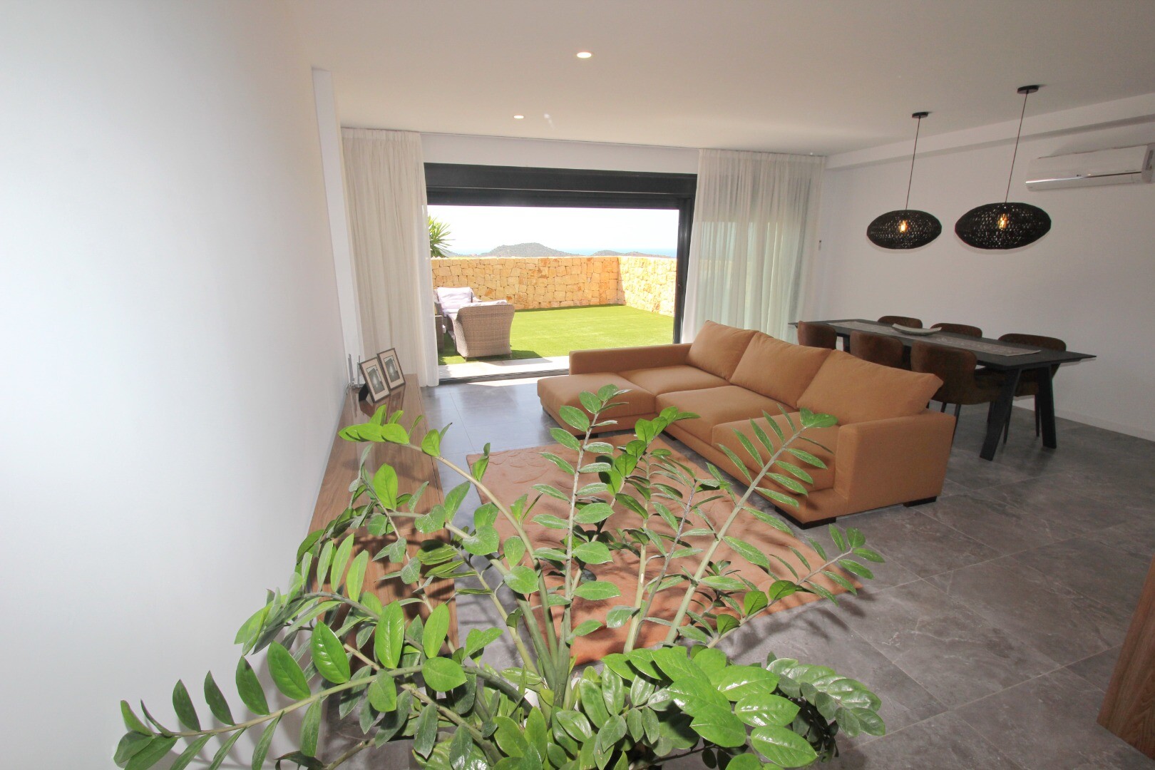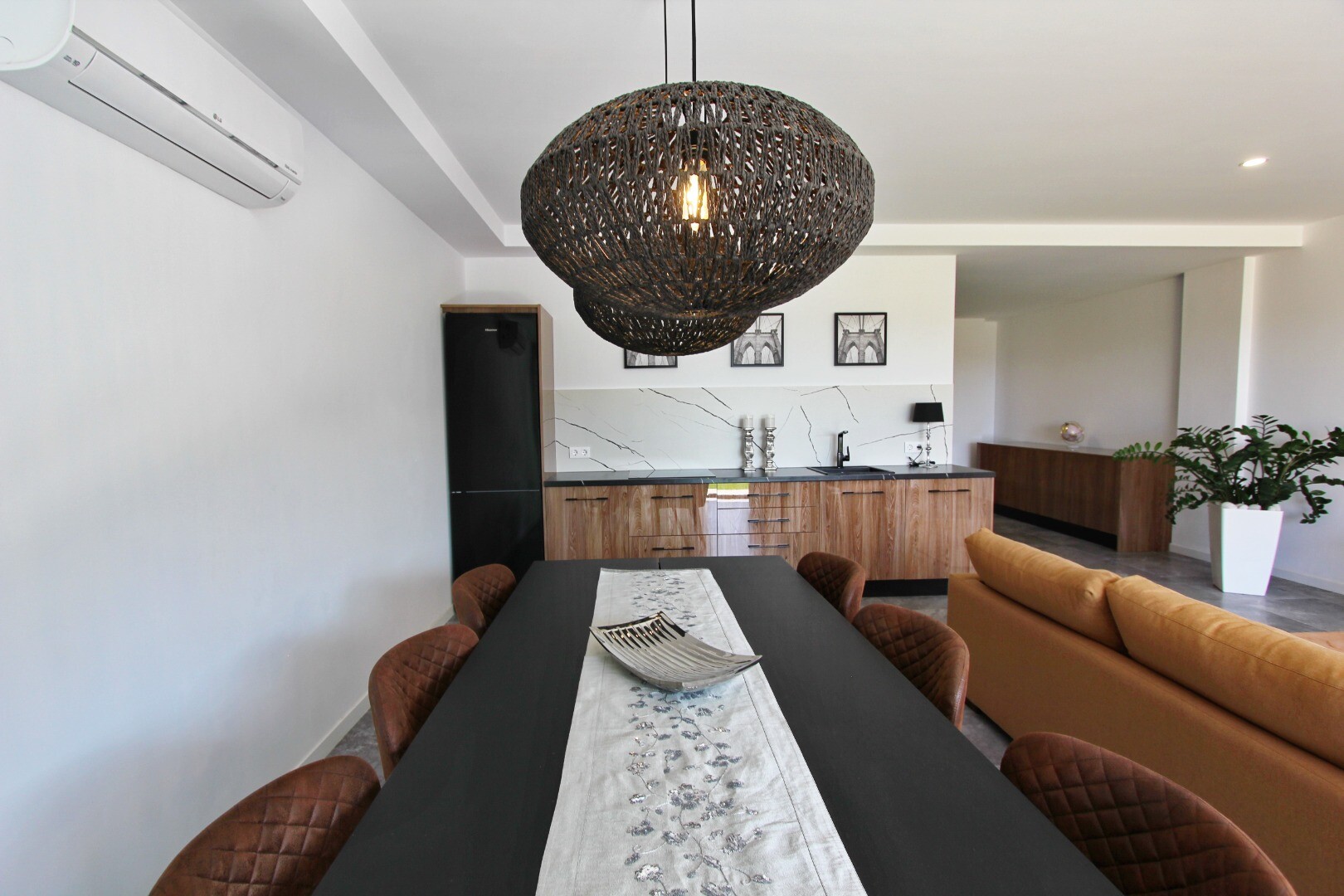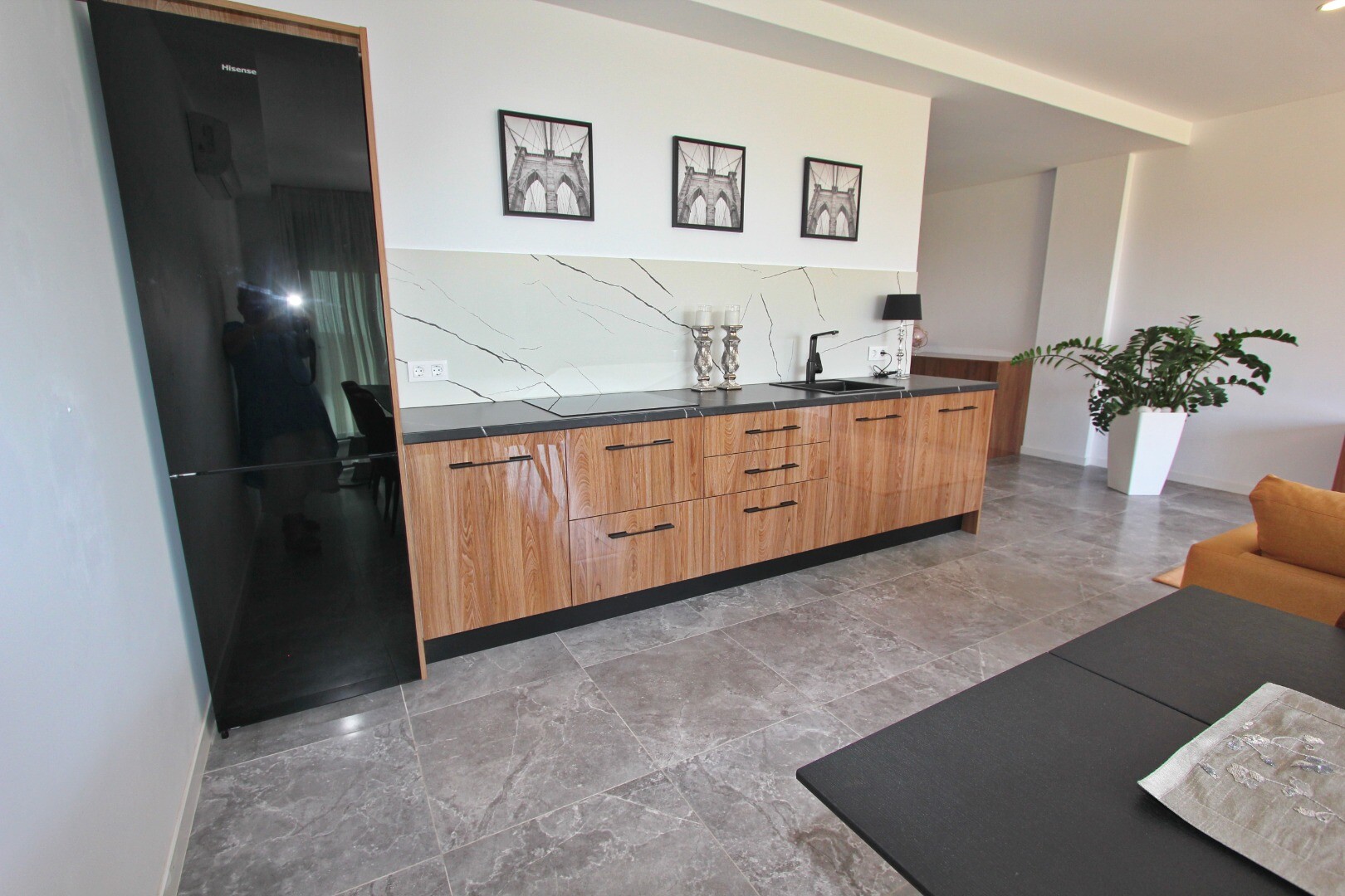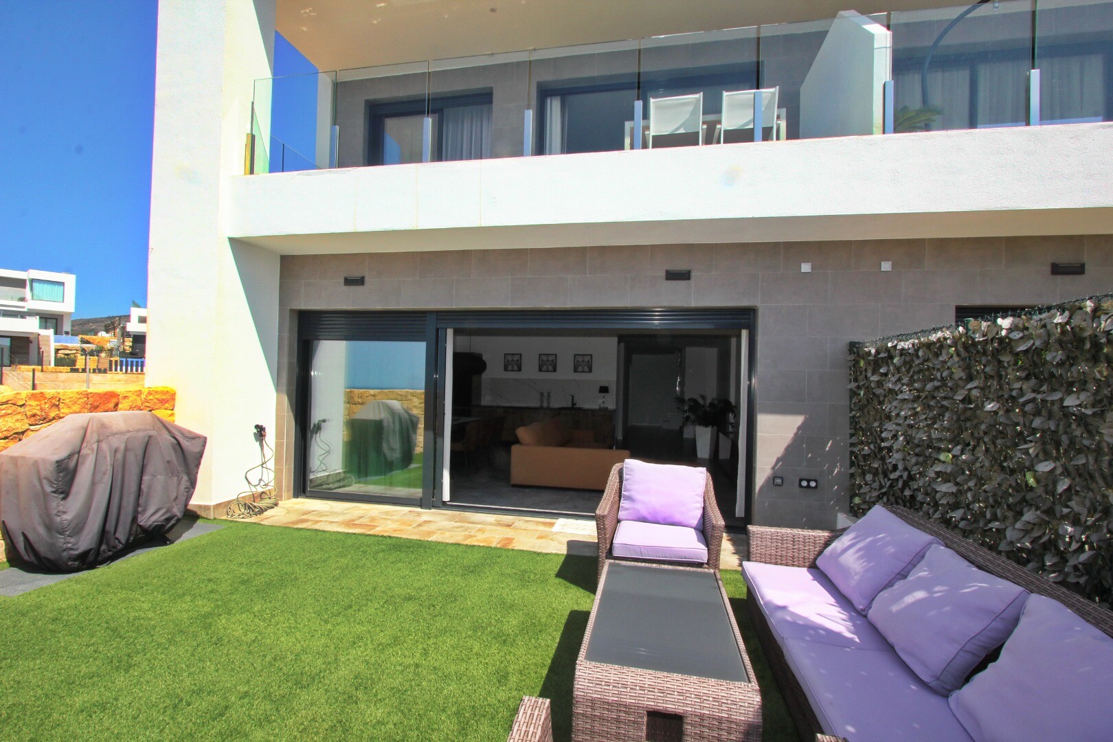 Įėjimo lygyje yra jauki svetainė su atvira virtuve, iš kurios galima patekti į erdvią terasą, o sodo lygyje yra dar viena didelė svetainė su atvira virtuve ir tiesioginiu išėjimu į gražų privatų sodą. Namas puikiai suplanuotas ir pilnai įrengtas, su aukščiausios klasės baldais ir naujausia buitine technika.