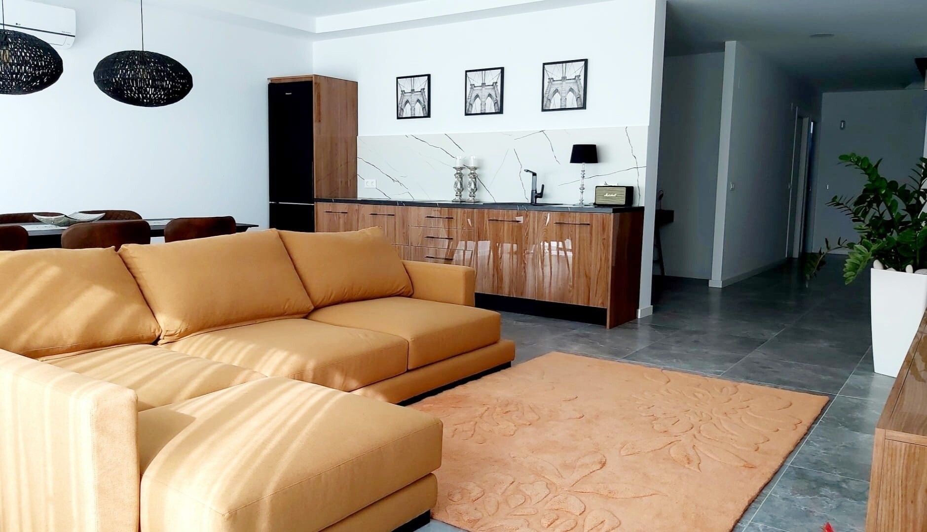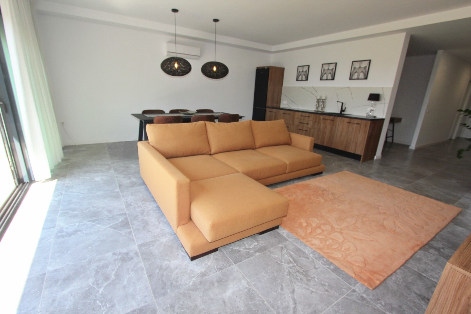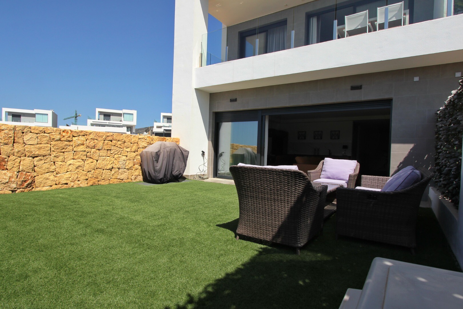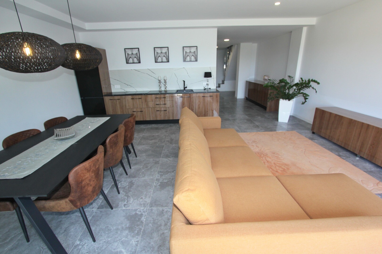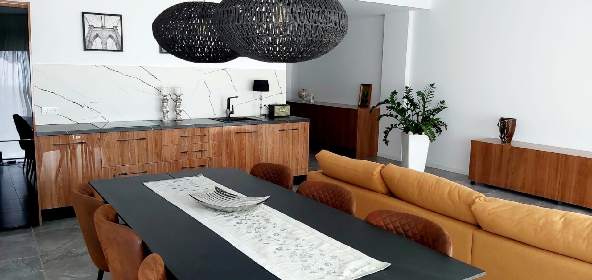 Įėjimo lygyje yra jauki svetainė su atvira virtuve, iš kurios galima patekti į erdvią terasą, o sodo lygyje yra dar viena didelė svetainė su atvira virtuve ir tiesioginiu išėjimu į gražų privatų sodą. Namas puikiai suplanuotas ir pilnai įrengtas, su aukščiausios klasės baldais ir naujausia buitine technika.