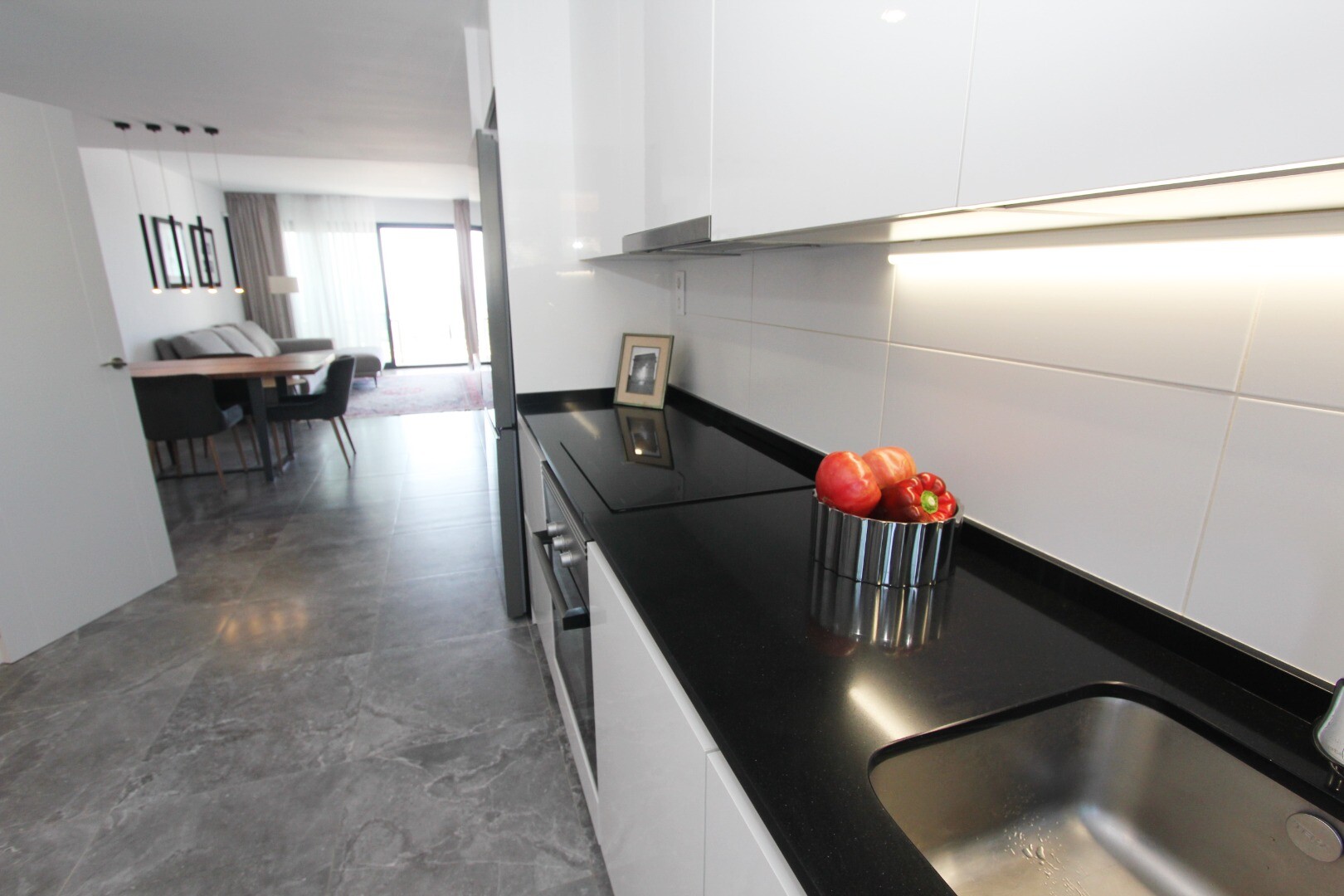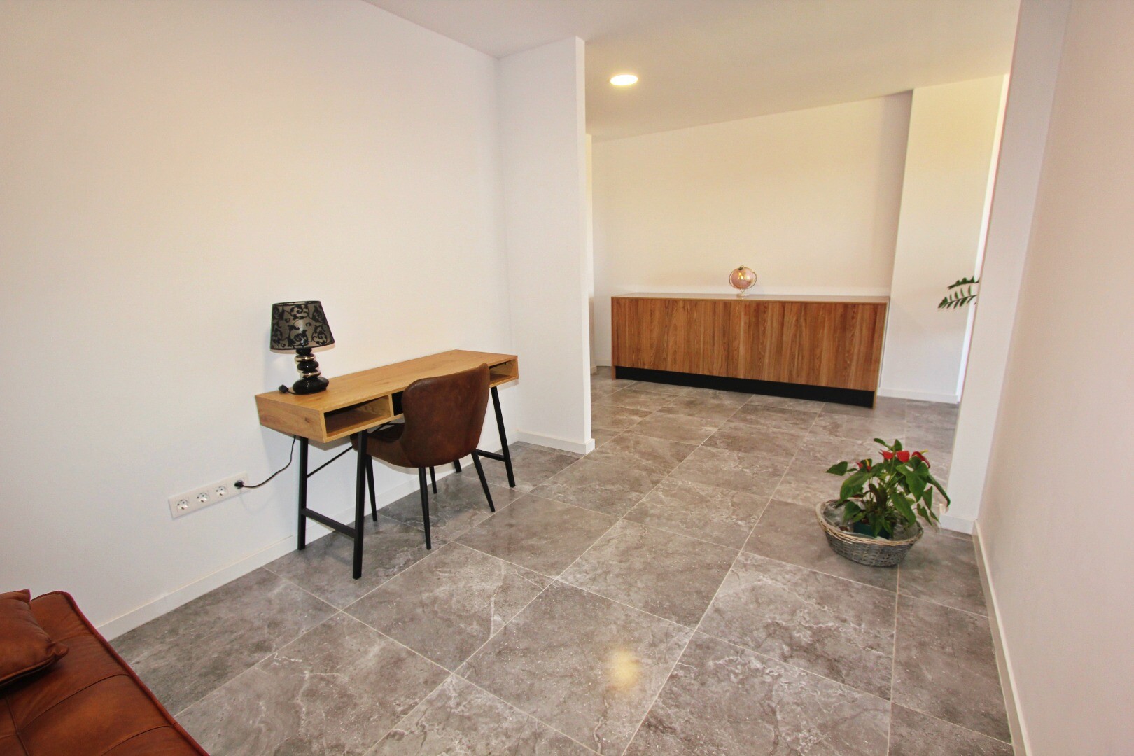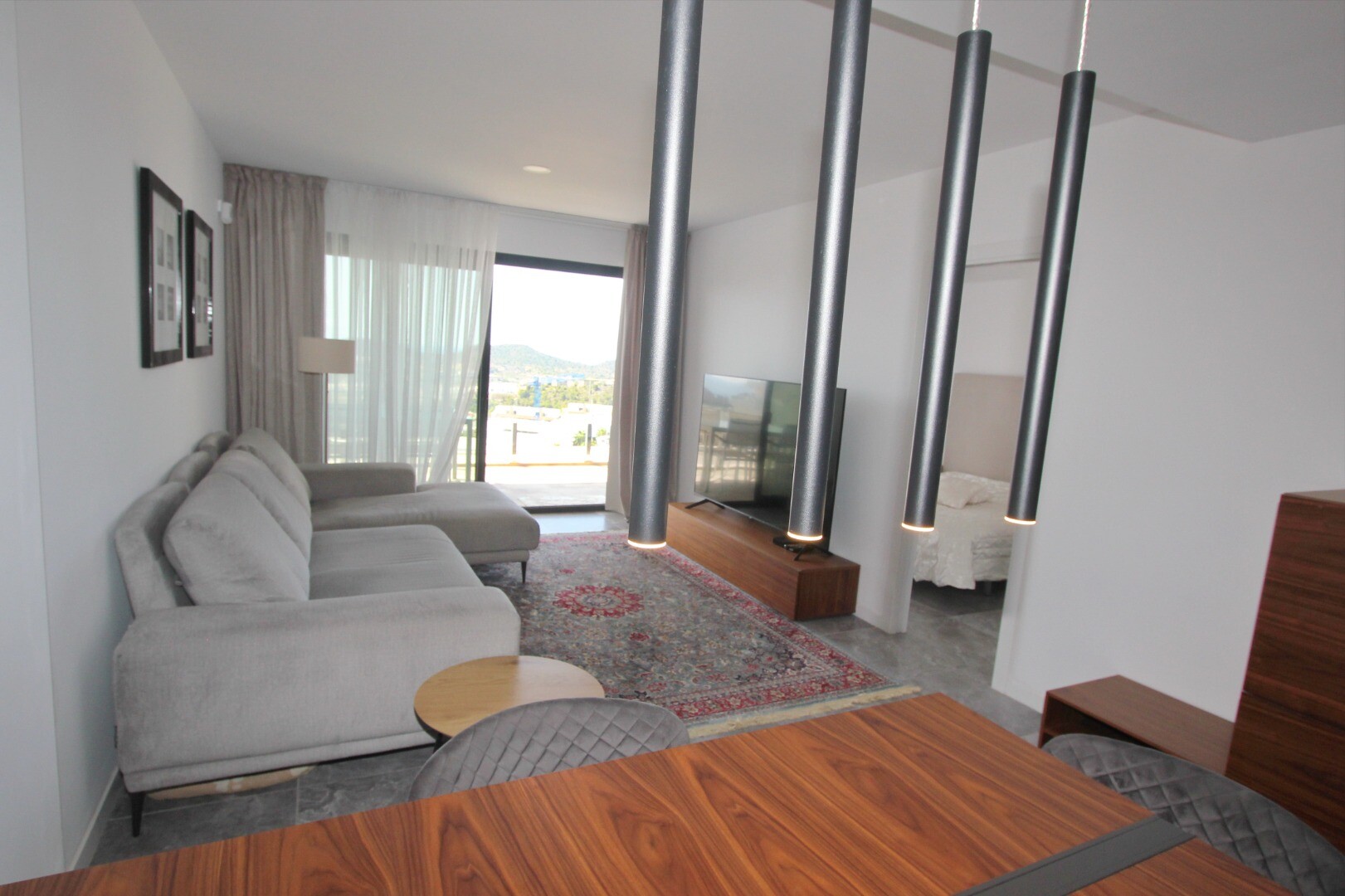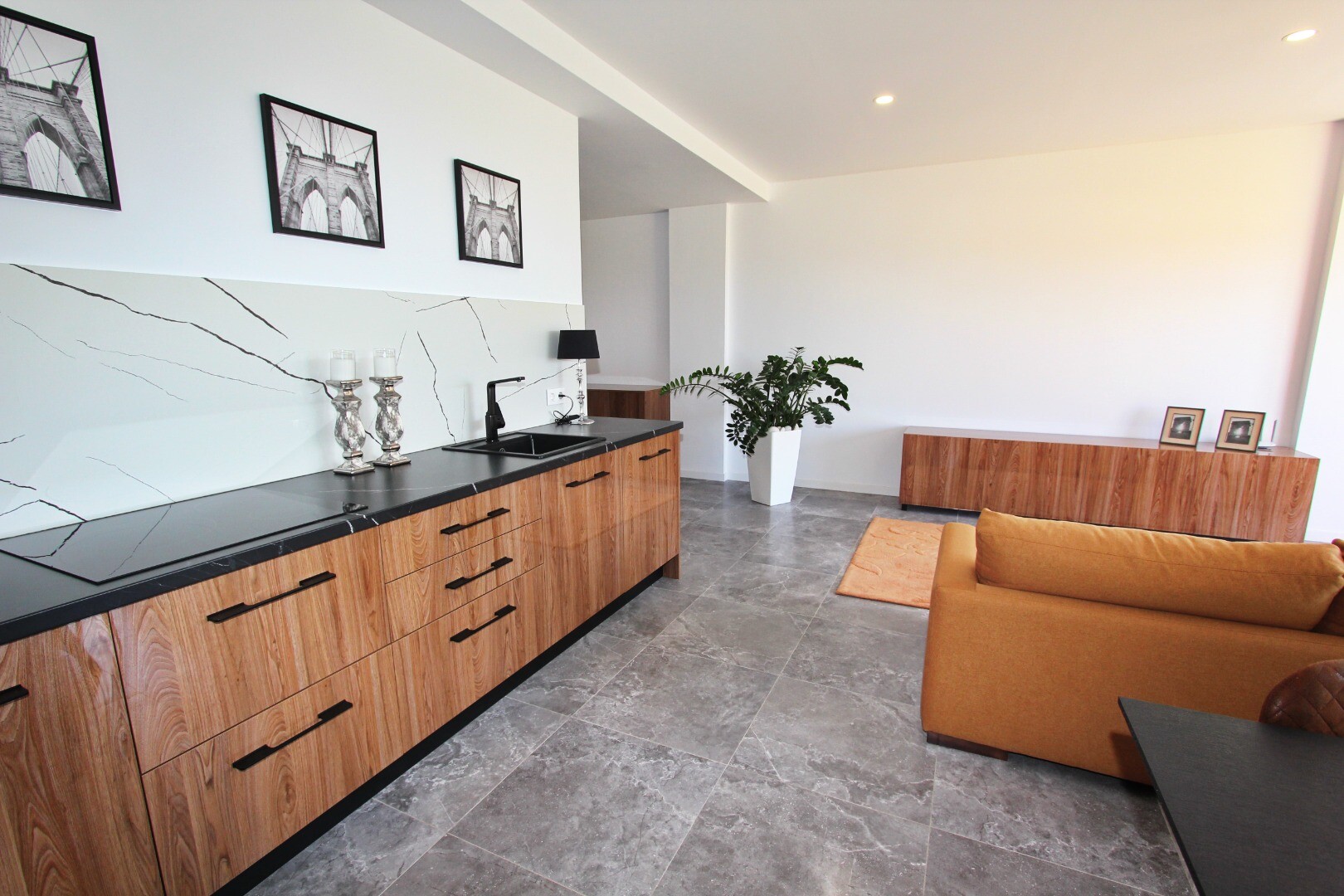 Įėjimo lygyje yra jauki svetainė su atvira virtuve, iš kurios galima patekti į erdvią terasą, o sodo lygyje yra dar viena didelė svetainė su atvira virtuve ir tiesioginiu išėjimu į gražų privatų sodą. Namas puikiai suplanuotas ir pilnai įrengtas, su aukščiausios klasės baldais ir naujausia buitine technika.