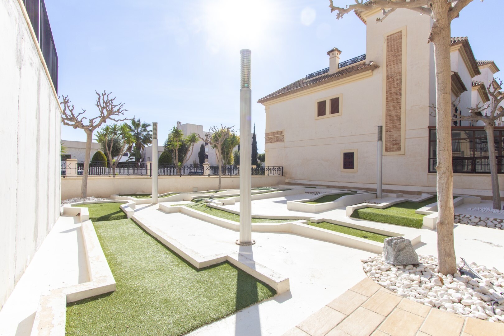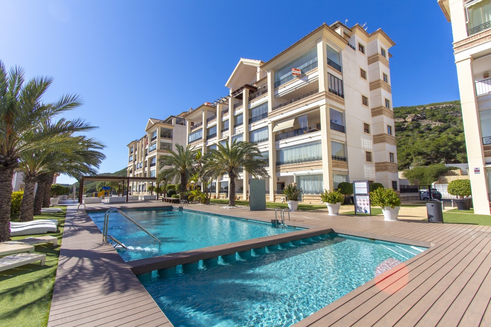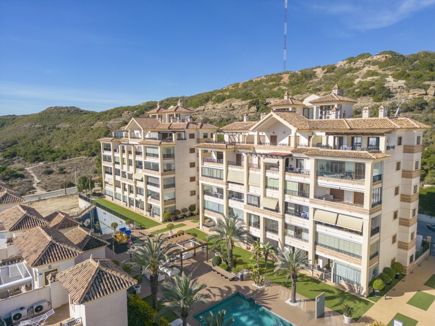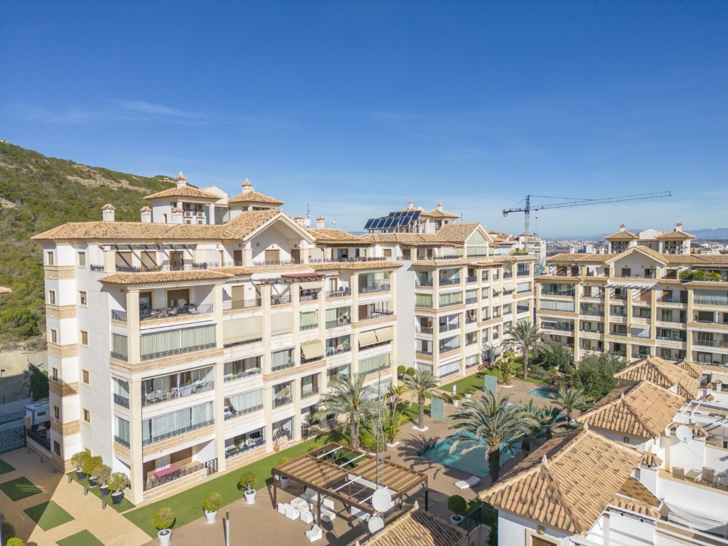 Butas pirmame aukšte, uždarame gyvenamajame rajone, su tiesioginiu išėjimu į sodo zoną su baseinu ir sodais. Namą sudaro 2 miegamieji ir 2 vonios kambariai, atskira virtuvė su galerija ir terasa, svetainė ir valgomasis, taip pat 2 miegamieji su išėjimu į didelę įstiklintą terasą. Gyvenamasis namas pastatytas naudojant aukščiausios kokybės medžiagas... ir apdailą, namuose yra motorizuotos žaliuzės, namų automatikos sistema, seifas, kanalizuotas oro kondicionierius ir daug daugiau detalių. Gyvenamajame name yra didelis vasaros ir žiemos baseinas, sauna, treniruoklių salė, padelio teniso kortai, mini golfas ir gražios sodo zonos, kuriomis galės mėgautis kaimynai. Į kainą įskaičiuota parkavimo vieta pastato rūsyje. Namas parduodamas su visais baldais ir buitine technika.