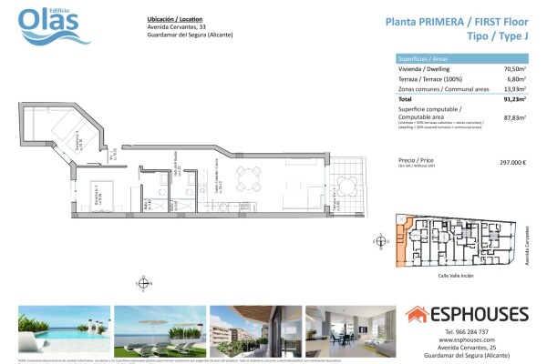 Įsikūręs viename iš paklausiausių Guardamar del Segura rajonų, prestižinėje Avenida de Cervantes gatvėje, "Edificio Olas" bus puikus pasirinkimas dėl to, kad yra netoli paplūdimio ir jame teikiamos įvairios paslaugos. Šio nuostabaus pastato terasoje bus įrengtas baseinas ir soliariumas, suteikiantis gyventojams poilsio ir pramogų oazę.