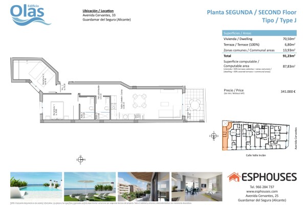 Įsikūręs prestižiniame Avenida de Cervantes prospekte, viename iš paklausiausių Guardamar del Segura rajonų, Edificio Olas bus įsikūręs. Šis puikus pasirinkimas siūlo idealią kaimynystę su paplūdimiu ir platų paslaugų spektrą. Šiame išskirtiniame pastate, išsiskiriančiame iš minios, bus įrengtas baseinas ir soliariumas ant stogo, kuriame gyventojai... galės atsipalaiduoti ir mėgautis. Aptariamą butą sudarys du miegamieji, du vonios kambariai, šviesi svetainė-valgomasis su integruota virtuve ir jauki terasa. Užstatytas plotas - 87,83 kv. m, o terasa - 6,80 kv. m, todėl bute bus įrengta patogi ir moderni erdvė. Bute bus įrengti oro kondicionieriai ir namų automatikos sistema, leidžianti gyventojams valdyti ir automatizuoti įvairius namų aspektus, kad būtų užtikrintas didesnis komfortas ir energijos vartojimo efektyvumas. Virtuvėje bus sumontuota aukštos kokybės buitinė technika: orkaitė, indaplovė, šaldytuvas su šaldikliu, gartraukis ir indukcinė kaitlentė, todėl bus sukurta funkcionali ir moderni erdvė, kurioje bus galima gaminti maistą ir mėgautis maistu su šeima bei draugais. Be to, yra galimybė įsigyti automobilių stovėjimo vietą ir sandėliuką pačiame pastate, suteikiant gyventojams daugiau patogumo ir vietos daiktams laikyti. Edificio Olas bus įsikūręs privilegijuotoje vietoje, netoli paplūdimio ir apsuptas įvairių paslaugų ir patogumų, tokių kaip restoranai, parduotuvės, prekybos centrai ir laisvalaikio zonos. Guardamar del Segura, garsėjantis puikiais smėlio paplūdimiais ir nuostabia gamta, siūlo ramų ir ramesnį gyvenimo būdą, tačiau kartu ir visus reikalingus patogumus. Trumpai tariant, šis butas "Edificio Olas" yra puiki galimybė ieškantiems modernių ir patogių namų privilegijuotoje vietoje, kur visi patogumai ir paplūdimys yra vos už kelių metrų.