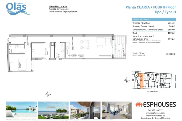 Įsikūręs viename iš paklausiausių Guardamar del Segura rajonų, Avenida de Cervantes, Edificio Olas bus puikus pasirinkimas dėl savo privilegijuotos vietos, esančios netoli paplūdimio ir įvairių paslaugų. Šis modernus pastatas savo gyventojams pasiūlys išskirtinę gyvenimo patirtį, kurioje dera komfortas, stilius ir pakrantės aplinka. Šiame pastate s...iūlomą butą sudarys 2 miegamieji, 2 vonios kambariai, erdvi svetainė-valgomasis su integruota virtuve ir graži terasa. Užstatytas plotas - 85,74 kv. m, o terasos plotas - 6,05 kv. m, todėl ši erdvė siūlo erdvumą ir komfortą visai šeimai. Šio buto apdaila ir funkcijos bus aukštos kokybės. Jame bus įrengta oro kondicionavimo įranga, kuri garantuos vėsią ir malonią atmosferą ištisus metus. Be to, integruota namų automatika leis išmaniai ir patogiai valdyti įvairias namų funkcijas, užtikrinant didesnį komfortą ir energijos vartojimo efektyvumą. Virtuvėje, suprojektuotoje atsižvelgiant į stilių ir funkcionalumą, bus sumontuota aukščiausios kokybės buitinė technika, įskaitant orkaitę, indaplovę, šaldytuvą su šaldikliu, gartraukį ir indukcinę kaitlentę. Šioje puikiai įrengtoje erdvėje skanų maistą gaminti bus vienas malonumas. Be to, "Edificio Olas" siūlo galimybę įsigyti tame pačiame pastate esančią automobilių stovėjimo aikštelę ir sandėliuką, o tai suteikia papildomo patogumo ir saugumo gyventojams. Taigi, nereikės rūpintis automobilių stovėjimo aikštele ar papildomų daiktų laikymu. Be vidaus patogumų, pastate bus įrengtas puikus baseinas ant stogo, kuriame gyventojai galės mėgautis gaiviais pasiplaukiojimais ir atpalaiduojančiomis akimirkomis saulėje. Trumpai tariant, "Edificio Olas" Guardamar del Segura mieste - tai unikali galimybė įsigyti šiuolaikišką butą nepakartojamoje vietoje. Modernaus dizaino, aukštos kokybės patogumais, netoli paplūdimio ir paslaugų, ši vieta žada pasiūlyti patogų, nepamirštamų akimirkų kupiną gyvenimą nuostabioje Viduržemio jūros pakrantėje.