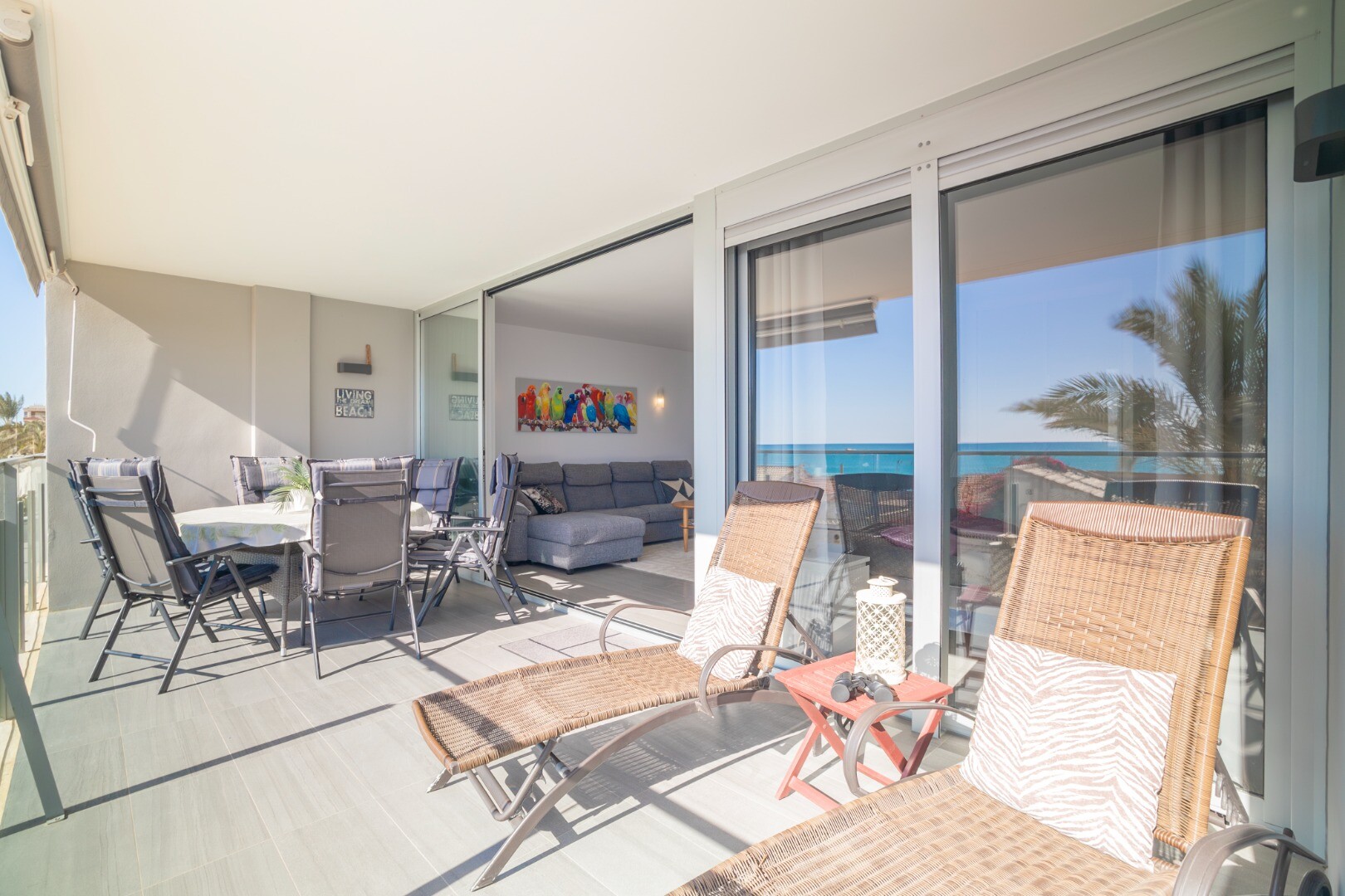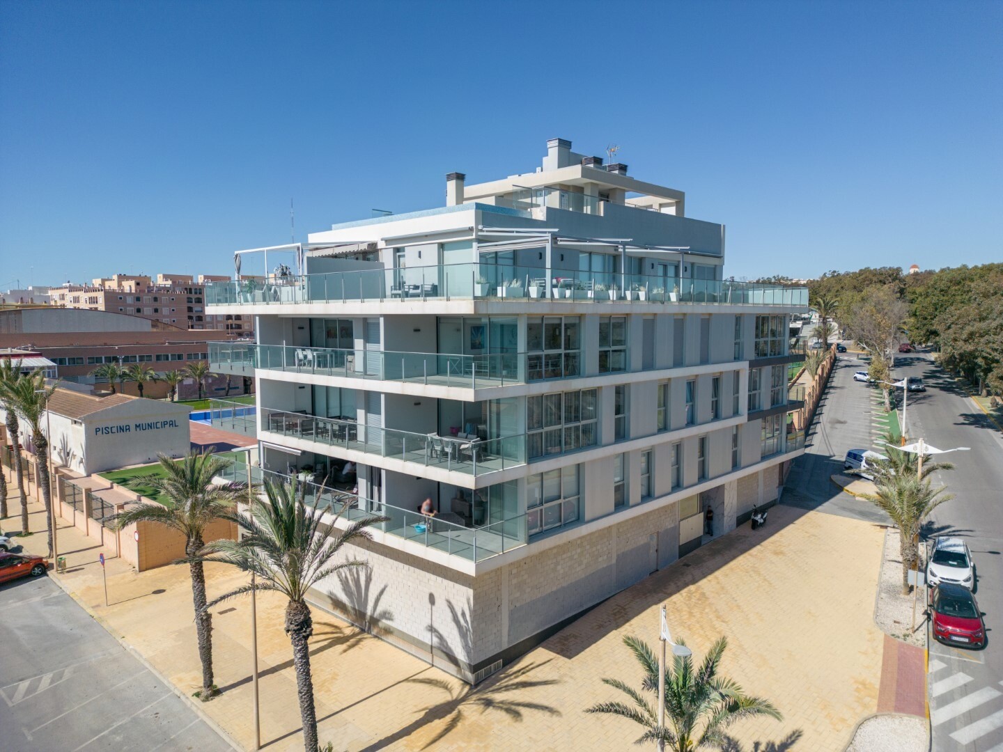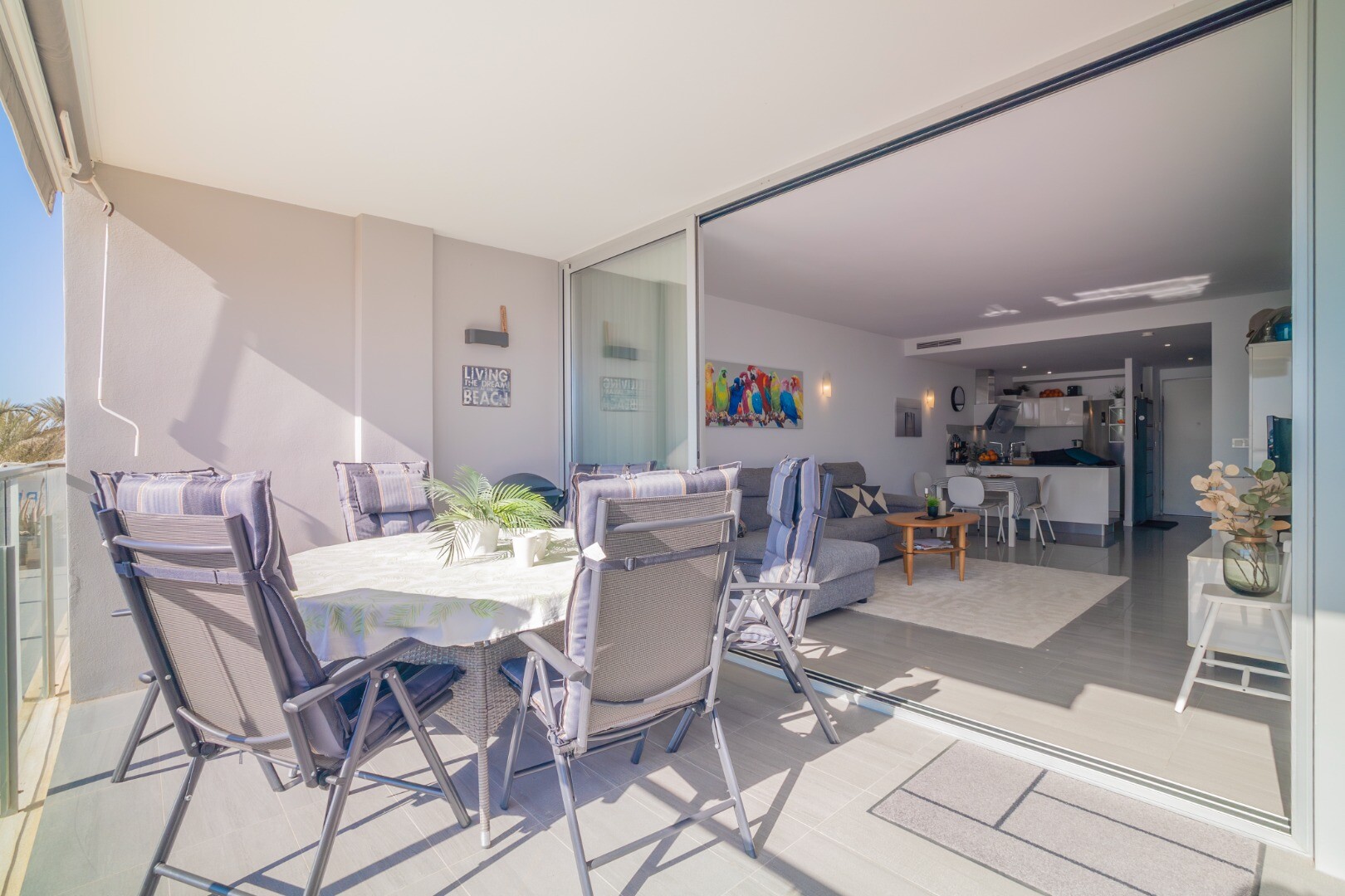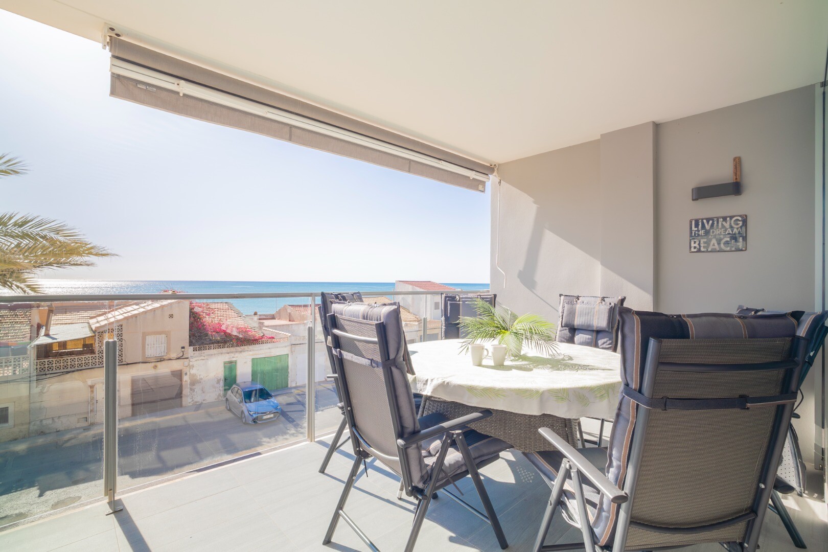 Norėtume jums pristatyti šį modernų ir erdvų būstą, kuriame yra 3 miegamieji su įmontuotomis spintomis, 2 vonios kambariai (vienas iš jų su v...onios kambariu), svetainė-valgomasis ir virtuvė su išėjimu į didelę terasą, iš kurios atsiveria frontalūs Viduržemio jūros vaizdai.