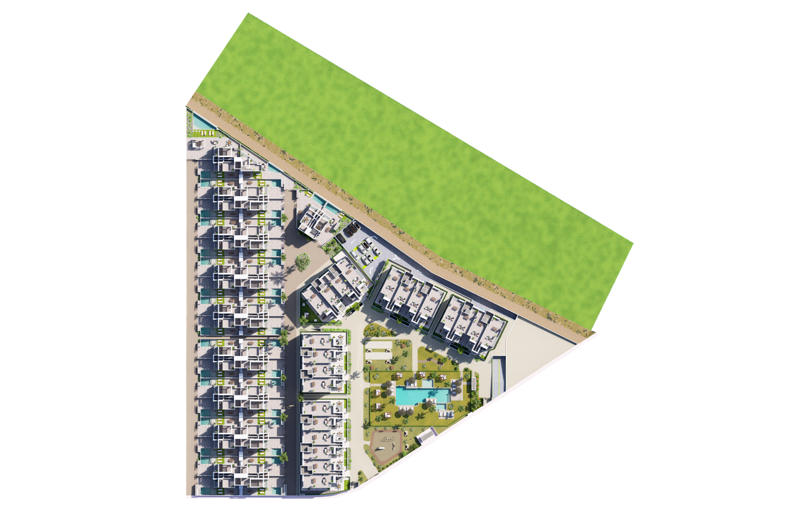 Kompleksas siūlo puikias bendras erdves: didelį centrinį baseiną paplūdimio stiliumi su balietiškomis lovomis, sūkurinės vonios zoną, vaikų baseiną, dvi petankės aikšteles, vaikų žaidimų zoną, sporto salę bei sauną/spa.