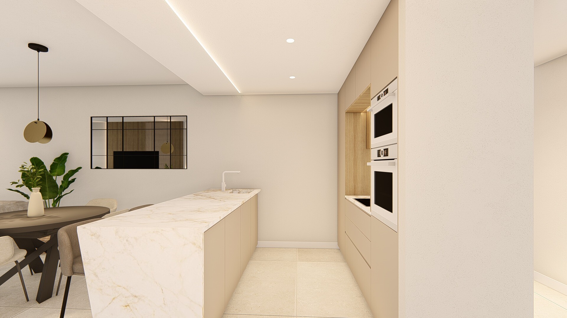 70 m² ploto būste yra du miegamieji su įmontuotomis spintomis ir du pilnai įrengti vonios kambariai. Svetainė su valgomuoju sujungta su atviro tipo virtuve, kuri yra ...pilnai įrengta ir su buitine technika.