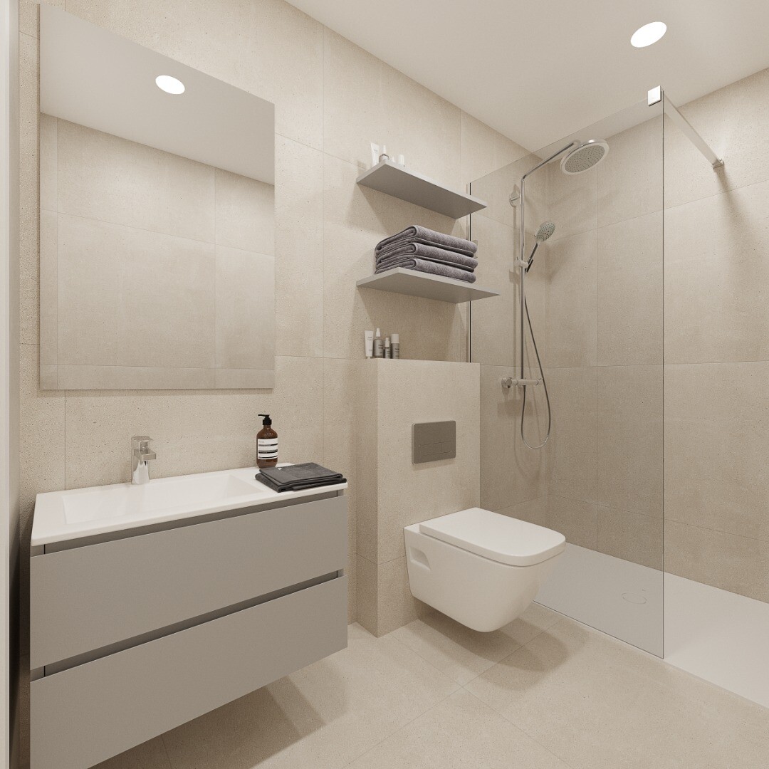 Prie baseino galima patekti į paplūdimį, yra dušas ir didelė medinė pavėsinė. Yra sutvarkytos teritorijos su palmėmis ir kita augmenija, kurios visos yra apšviestos. Centrinėje baseino dalyje yra seklesnė zona, kurioje yra vandens lovos. Siekiant pagerinti energijos vartojimo efektyvumą, patalpose yra fotovoltinė plokštė su 730 Wp mikroinverteriu, stebėjimo platforma per programėlę. 450 Wp skydas ant stogo, kuris taupo energiją namo elektros sąnaudoms. Kiekvienam turtui skirta vieta automobiliui kuo arčiau nuosavo kvartalo, pirmame aukšte. Į automobilių stovėjimo vietas patenkama per dvejus nuotoliniu būdu valdomus motorinius įvažiavimo vartus. Automobilių stovėjimo aikštelėje numatyta galimybė ateityje įrengti elektromobilių įkrovimo punktą iš kiekvieno gyvenamojo namo individualaus skaitiklio, laikantis taisyklių.