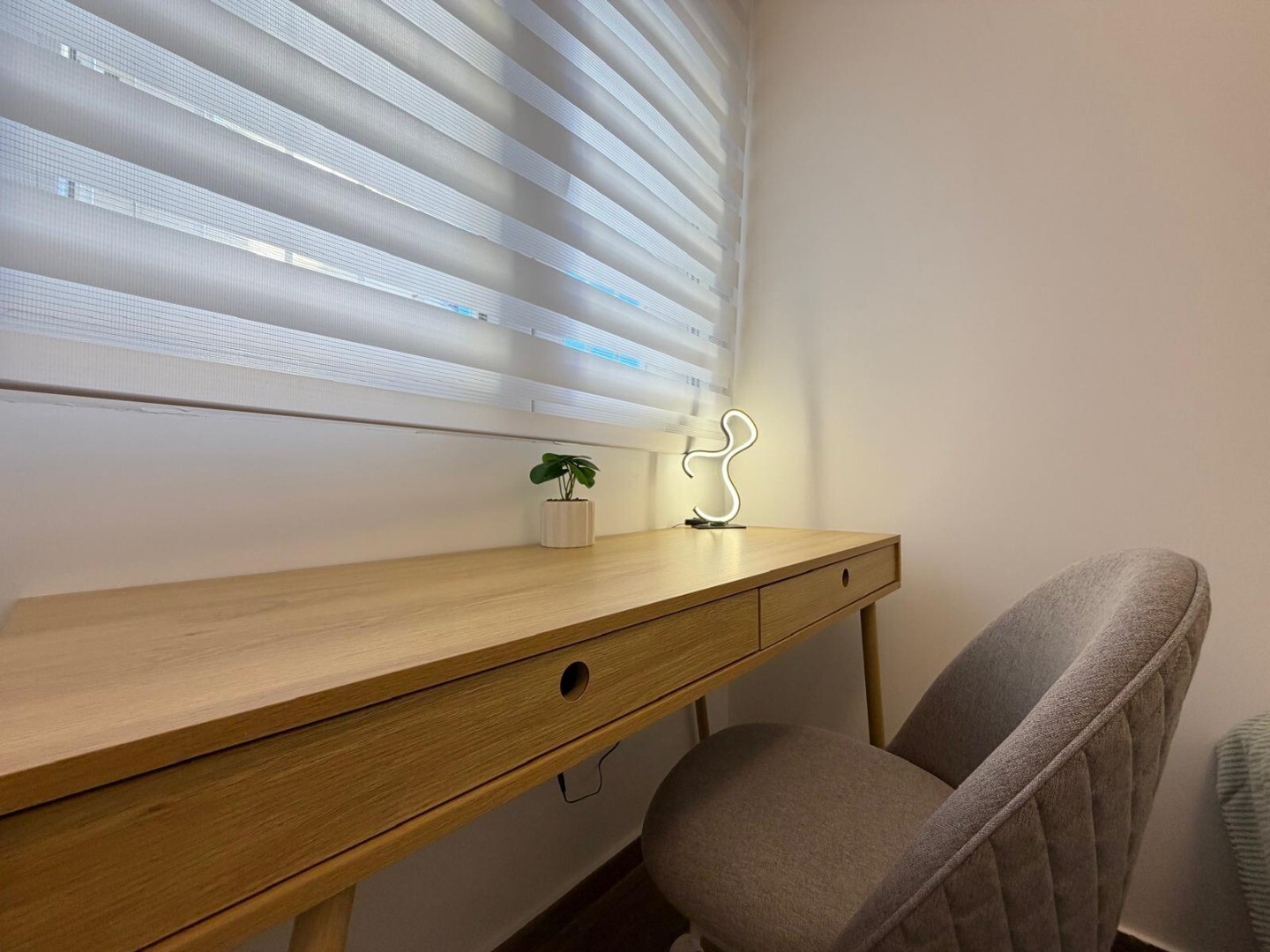 Buto plotas – 59 m², jame yra du miegamieji su įmontuotomis spintomis, vienas vonios kambarys ir šviesi svetainė su atvira virtuve.