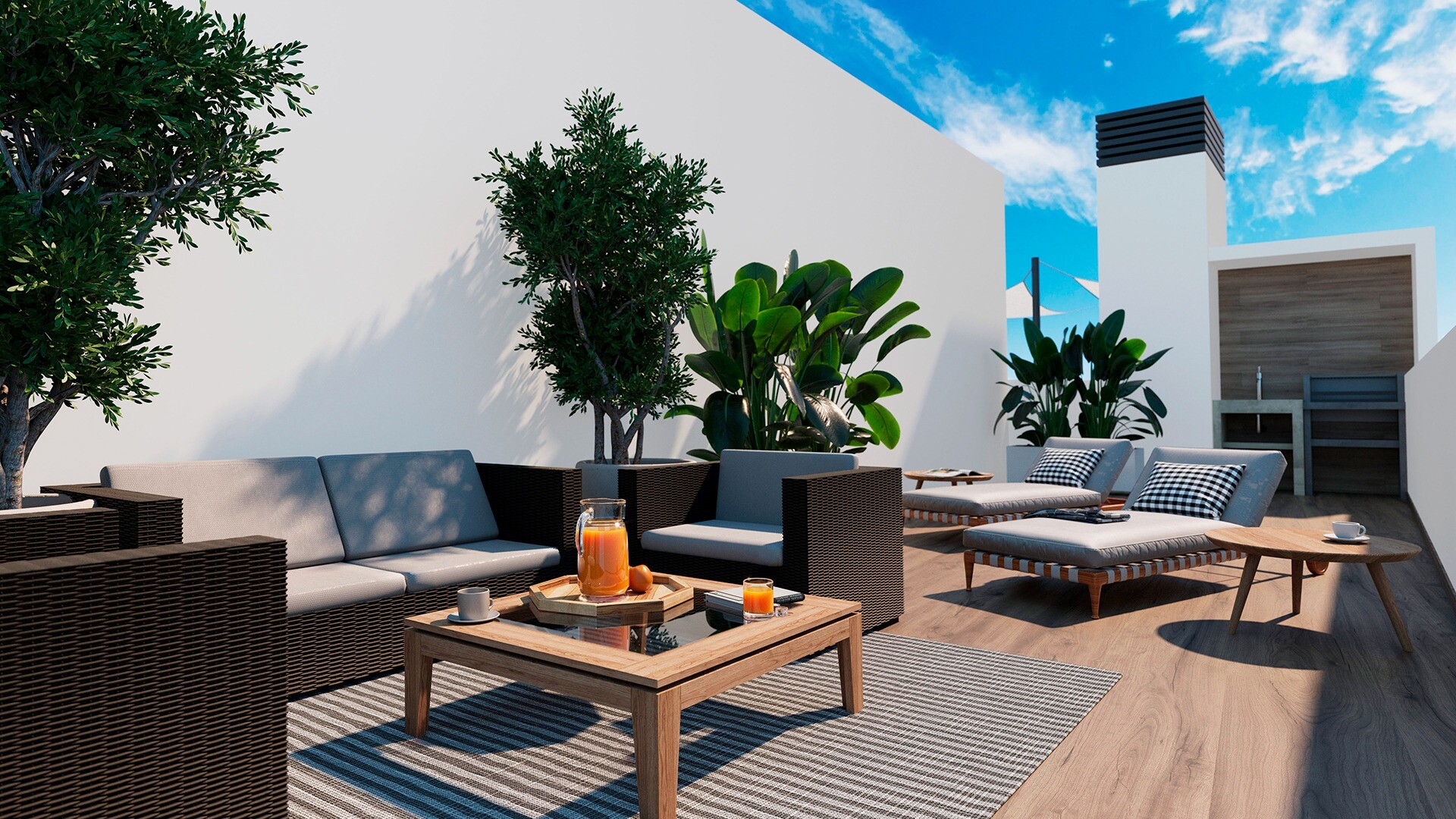 Būstas siūlo 69 m² bendro ploto, paskirstyto į 2 miegamuosius su įmontuotomis spintomis, 2 vonios kambarius ir šviesią svetainę su valgomojo zona bei atvira virtuve. 35 m² išorinės erdvės, padalytos tarp terasos ir privataus... solariumo, leidžia visiškai mėgautis Viduržemio jūros klimatu. Taip pat yra ortakinės oro kondicionavimo sistemos paruoša.