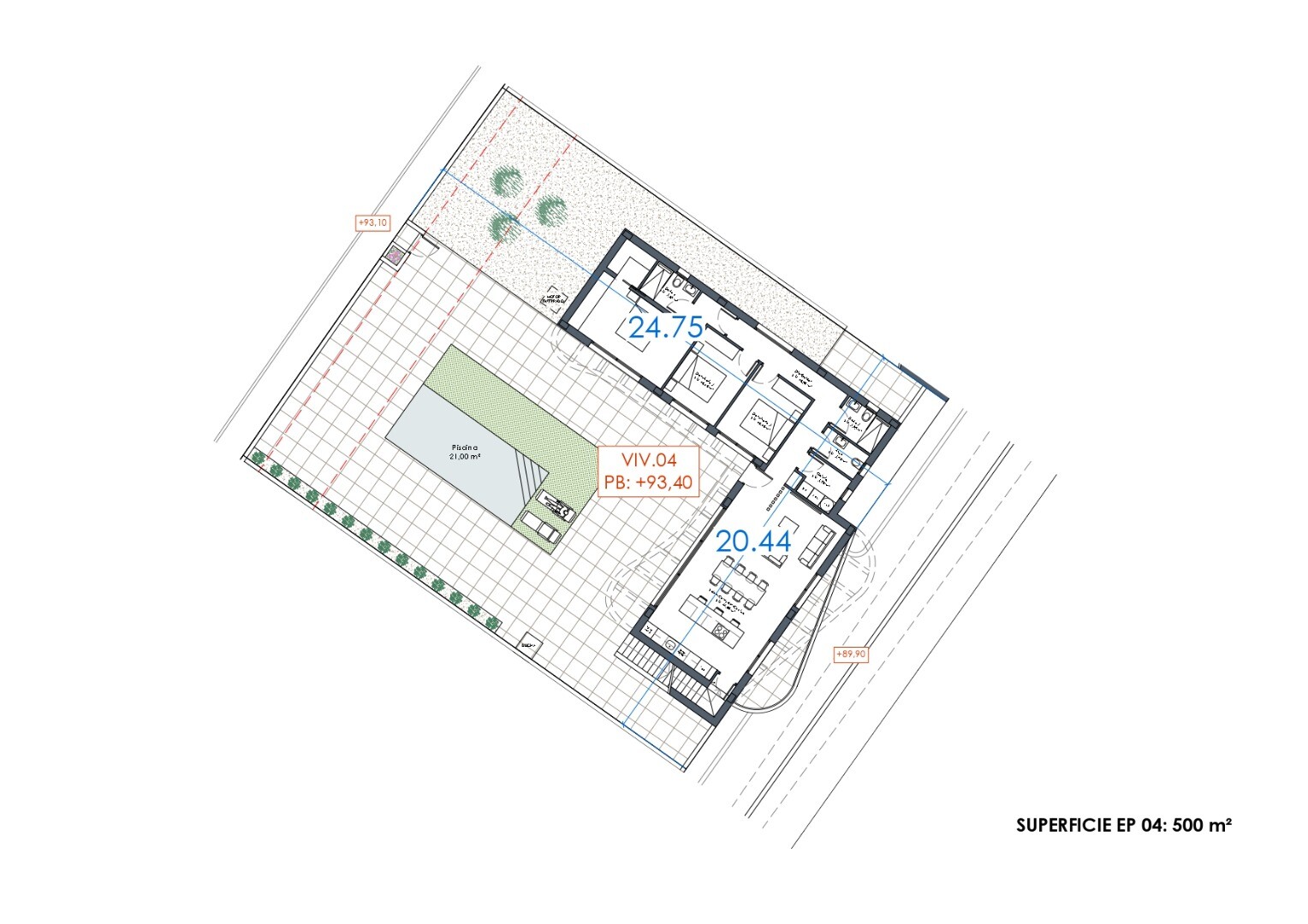 Siūlomi trys namų modeliai skirtingose ​​vietose. Didesniuose sklypuose esančiuose namuose yra 7x3 m baseinas. Mažesniuose – 6x3 m baseinas. Didesniuose sklypuose esančiuose namuose standartiškai yra rūsys, nors daugumai jis yra neprivalomas. Namuose iš anksto įrengta oro kondicionavimo sistema per ortakius.