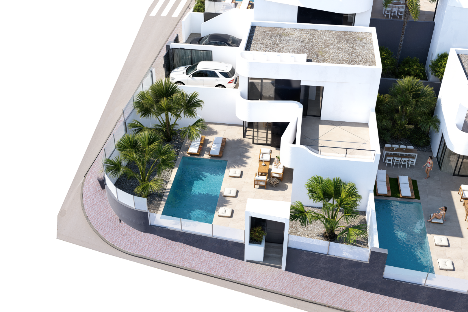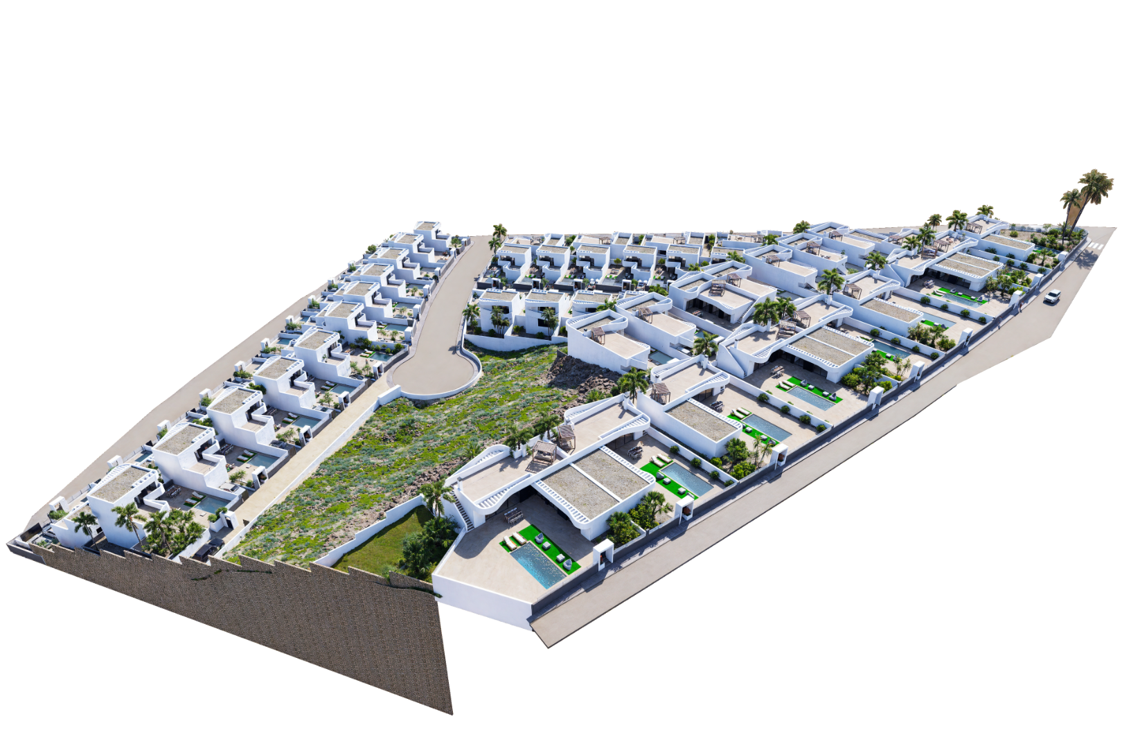 Siūlomi trys namų modeliai skirtingose vietose. Didesniuose sklypuose esančiuose namuose yra 7x3 m baseinas. Mažesniuose – 6x3 m baseinas. Didesniuose sklypuose esančiuose namuose standartiškai yra rūsys, nors daugumai jis yra neprivalomas. Namuose iš anksto įrengta oro kondicionavimo sistema per ortakius.