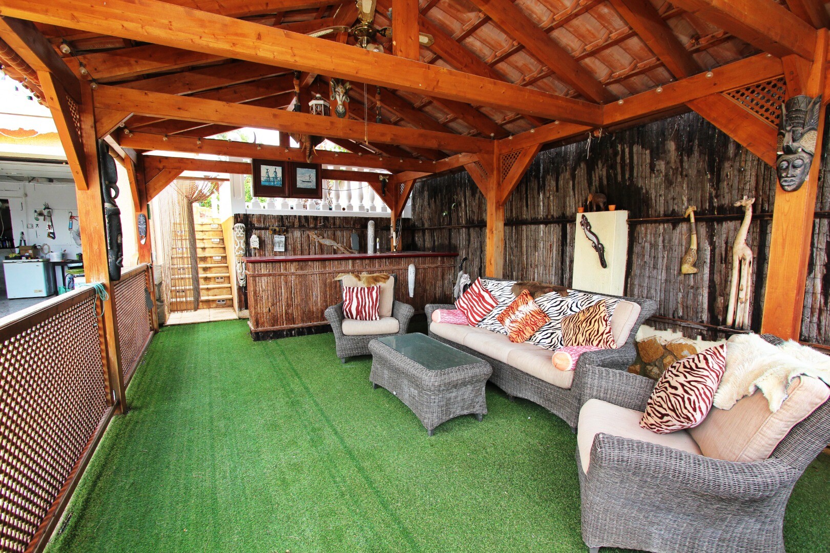 * Medinė namelio poilsio zona su baru