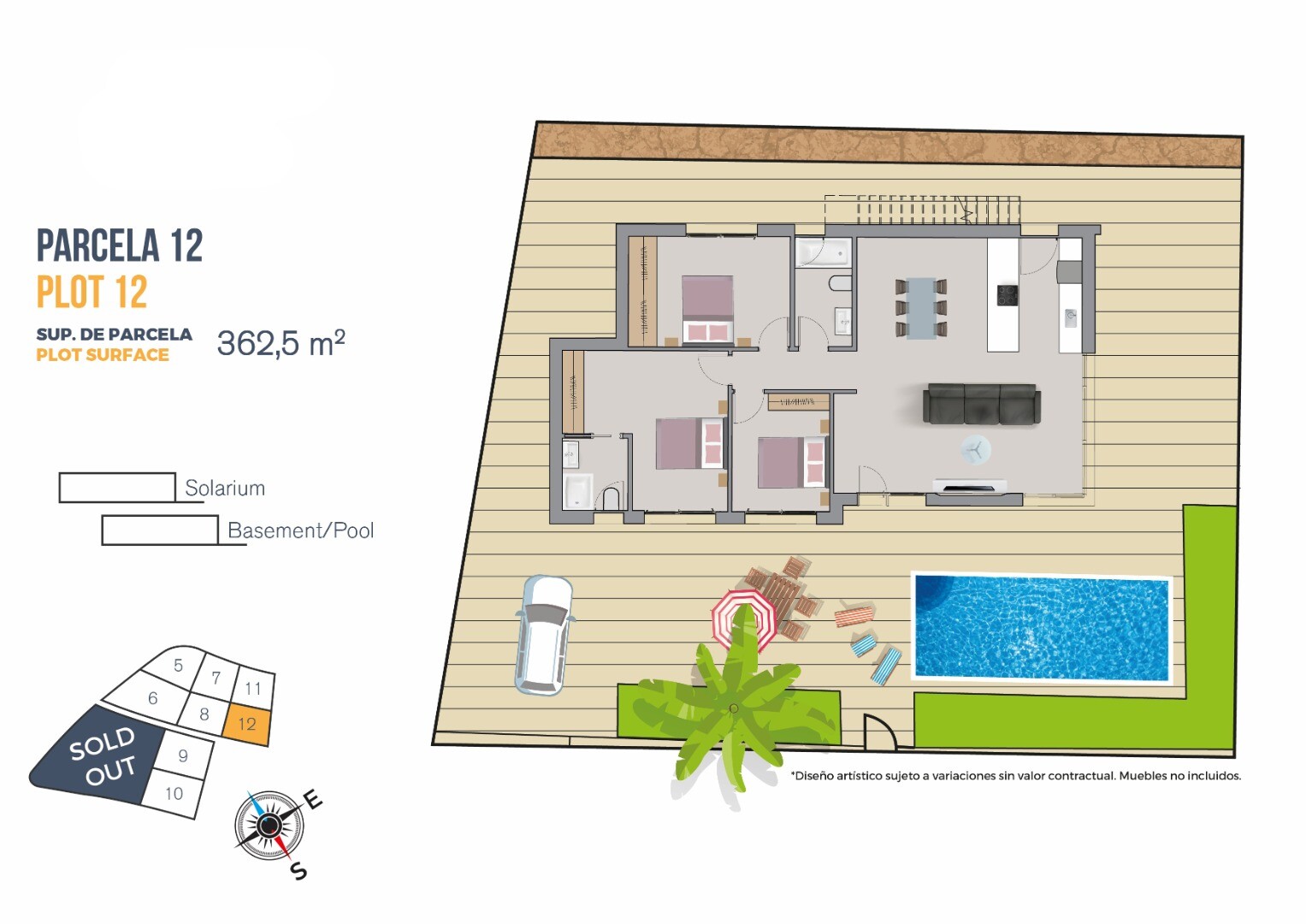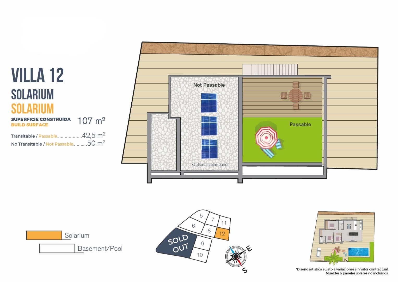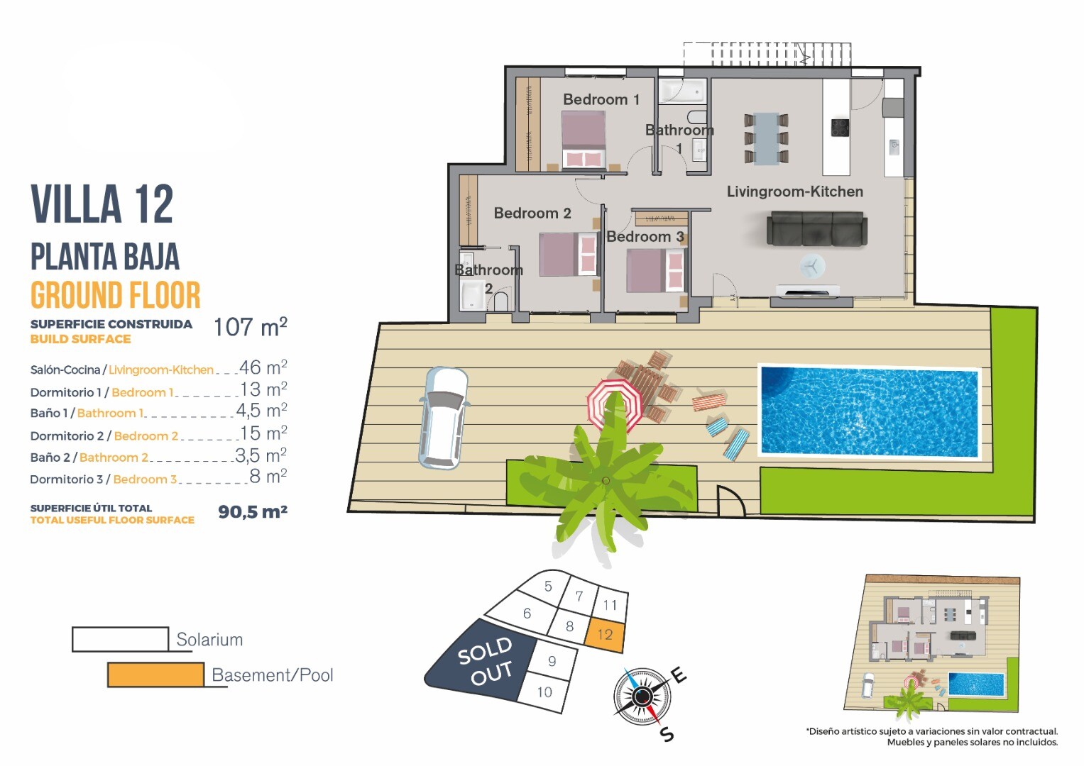 Šioje į pietryčius orientuotoje vieno aukšto viloje yra 3 miegamieji ir 2 vonios kambariai. Joje yra 46 m² ploto svetainė / valgomasis su vaizdu į baseiną. Sklype yra automobilių stovėjimo aikštelė, 6x3 m baseinas ir galimybė pastatyti kepsninę / lauko virtuvę. Bute yra iš anksto įrengtas oro kondicionierius per ortakius. Mūsų svetainėje esančiose ...nuotraukose matomas demonstracinis namas, kuriame galite įvertinti apdailos kokybę.