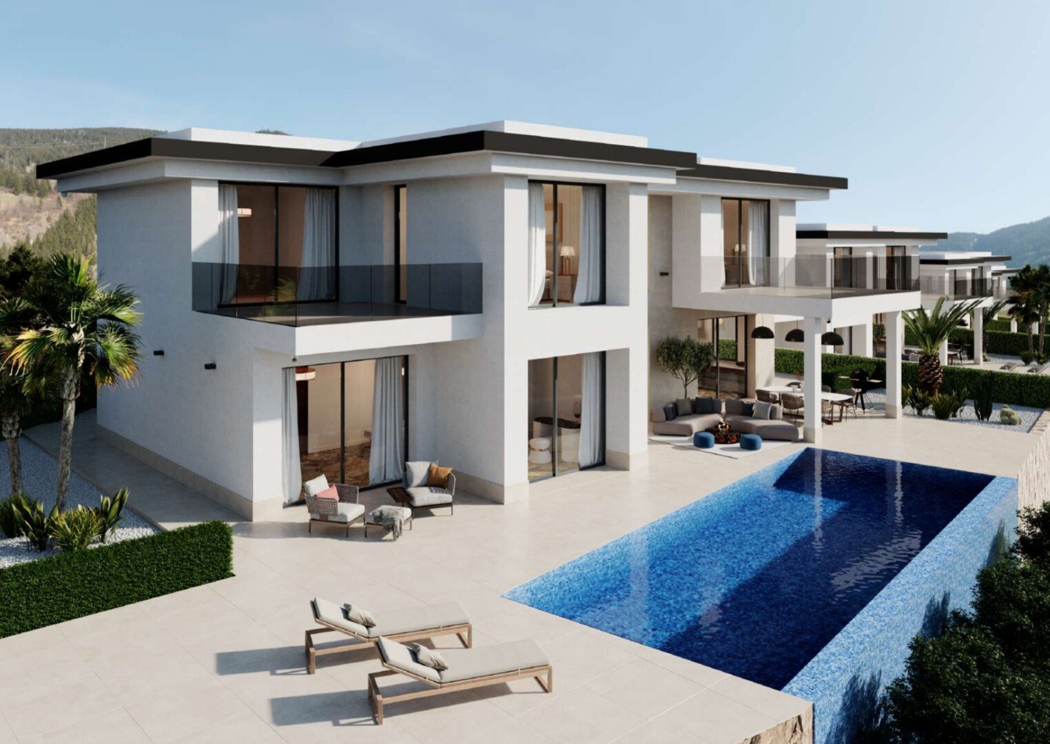 Naujas 3 šiuolaikinio stiliaus vilų su vaizdu į jūrą projektas, įsikūręs Finestrato savivaldybėje (Alikantė), apsuptas kalnuoto kraštovaizdžio ir vos 5 minutės kelio automobiliu nuo Benidormo.