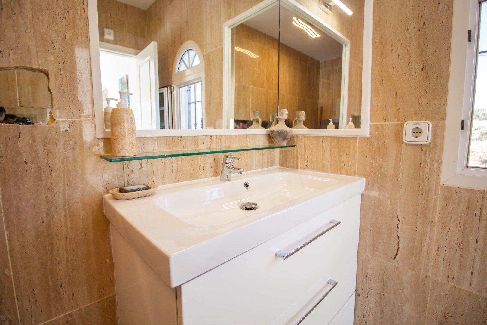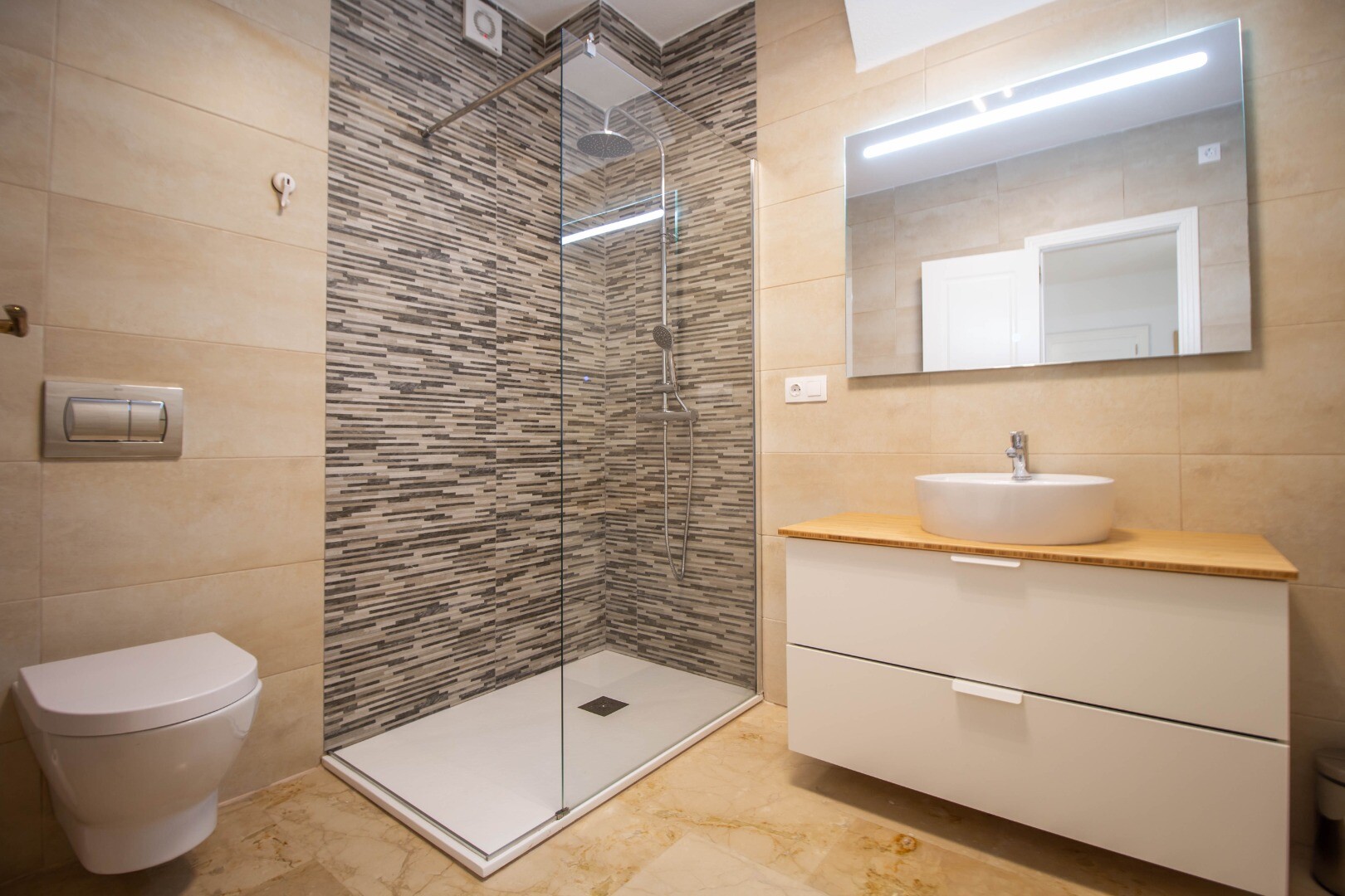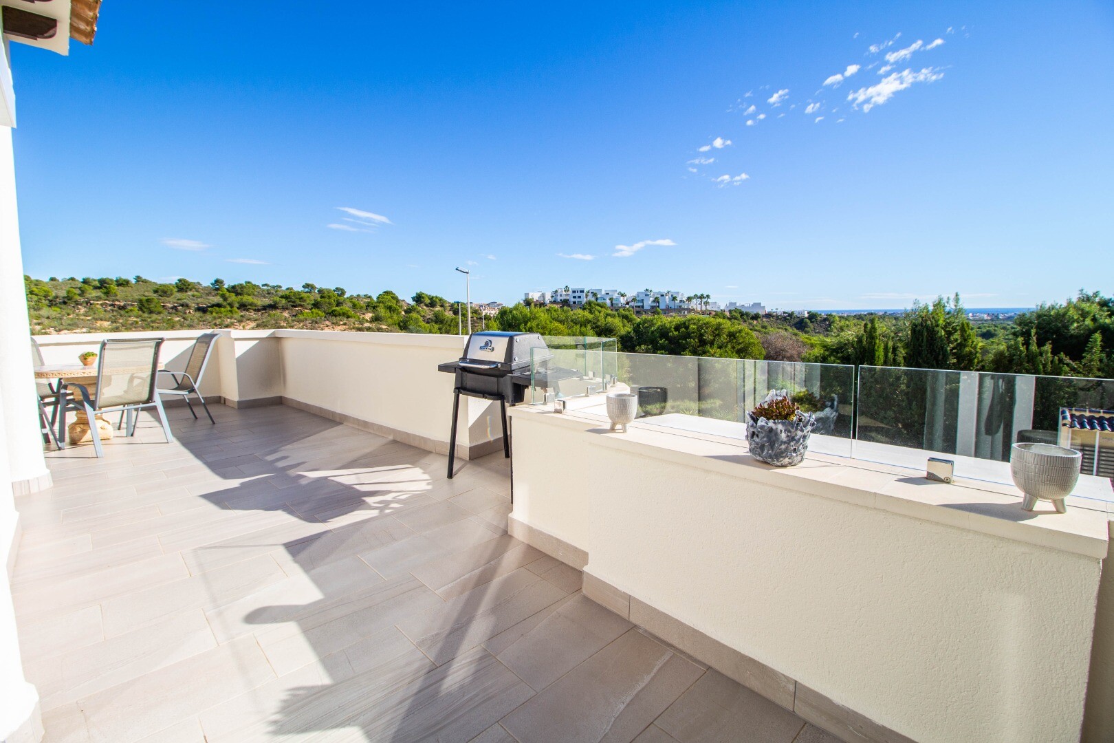 Viršutiniame aukšte randame labai didelę svetainę, valgomąjį ir virtuvę, su išėjimu į didelę terasą su kepsnine ir įspūdingu vaizdu į jūrą bei žalią zoną. čia taip pat yra dar vienas vonios kambarys.