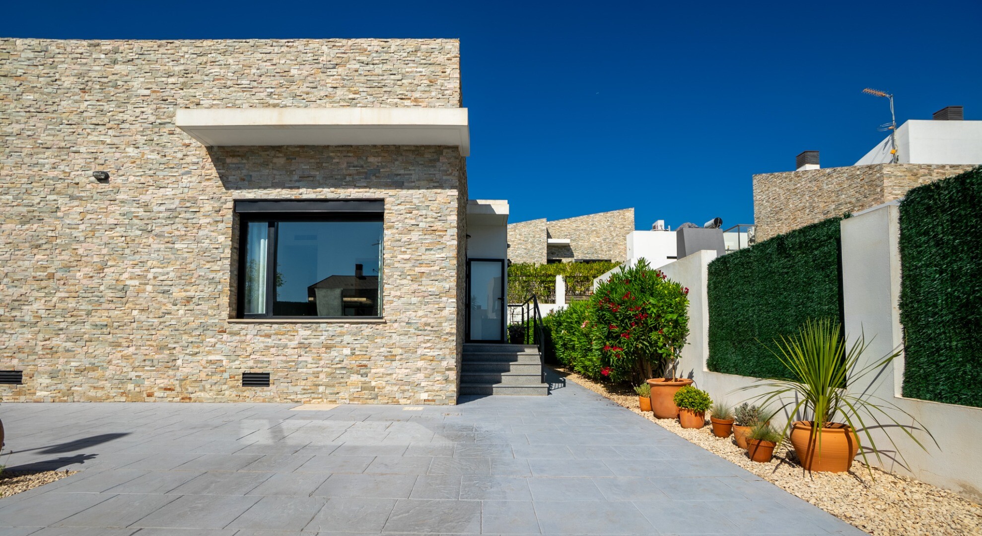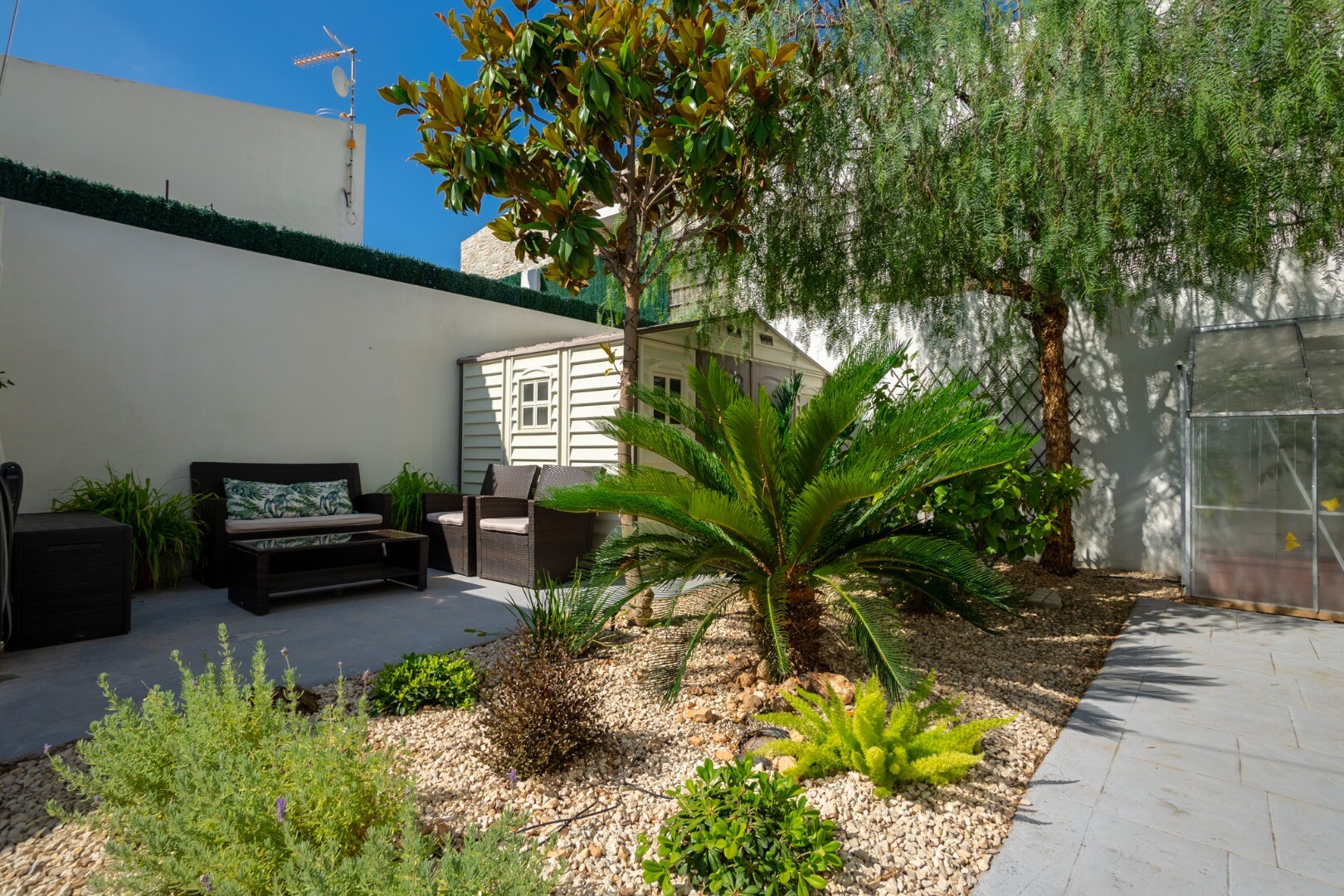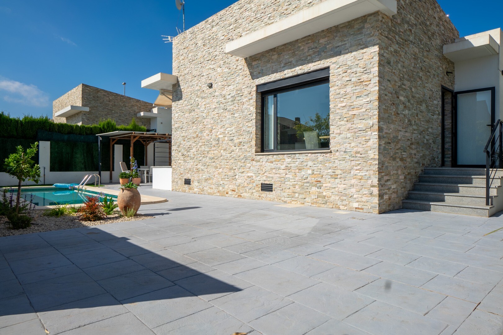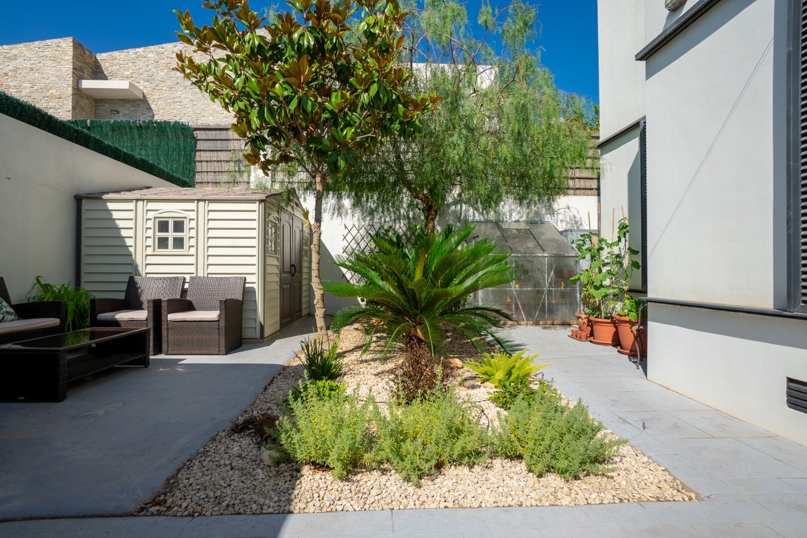 Dėl didelių langų į visus namus patenka natūrali šviesa, sukurianti jaukią atmosferą. Lauke yra privatus baseinas, mažai prižiūrimas sodas su oranžerija, dengta lauko valgomojo zona su kepsnine, didelė sandėliavimo / skalbykla, papildoma sandėliavimo spinta ir vieta automobiliui sklype.