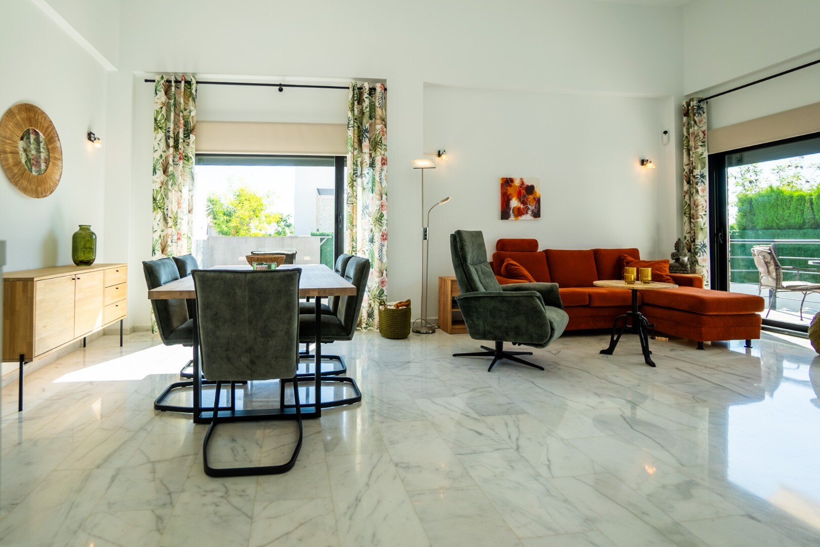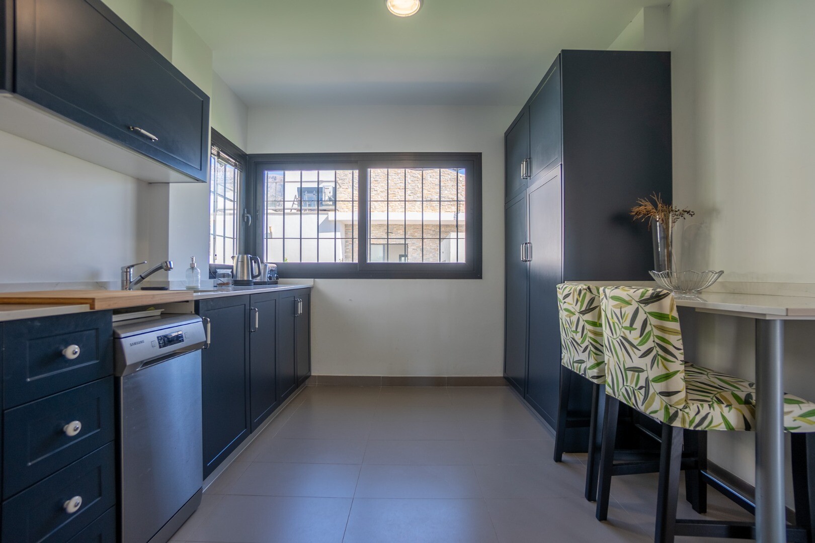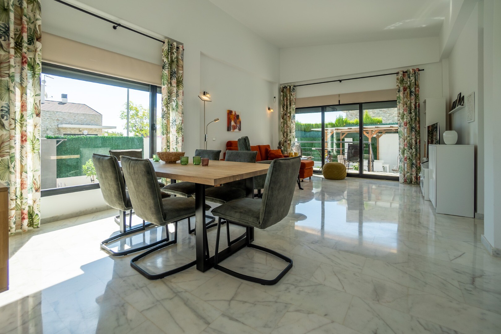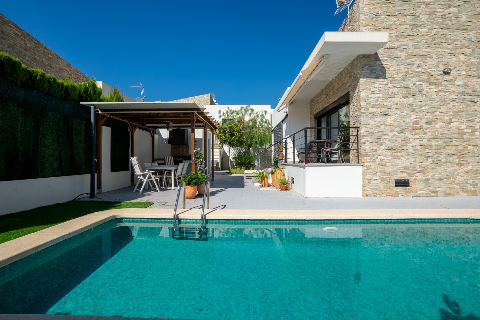 Dėl didelių langų į visus namus patenka natūrali šviesa, sukurianti jaukią atmosferą. Lauke yra privatus baseinas, mažai prižiūrimas sodas su oranžerija, dengta lauko valgomojo zona su kepsnine, didelė sandėliavimo / skalbykla, papildoma sandėliavimo spinta ir vieta automobiliui sklype.