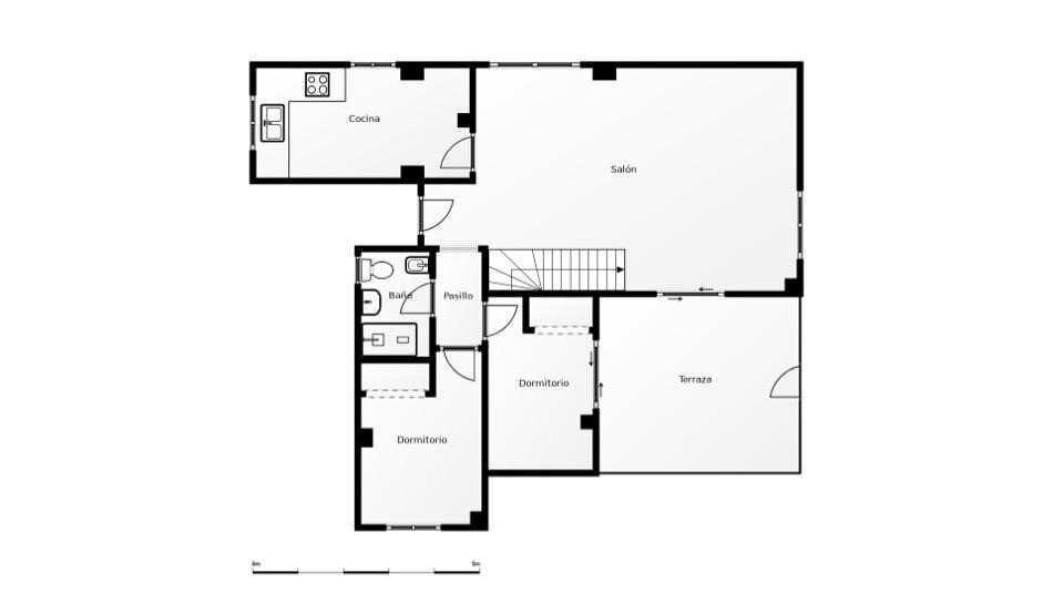 - Pirmame aukšte yra šviesi atviro plano svetainė ir valgomasis su amerikietiško stiliaus virtuve, dviem miegamaisiais ir vonios kamba...riu.