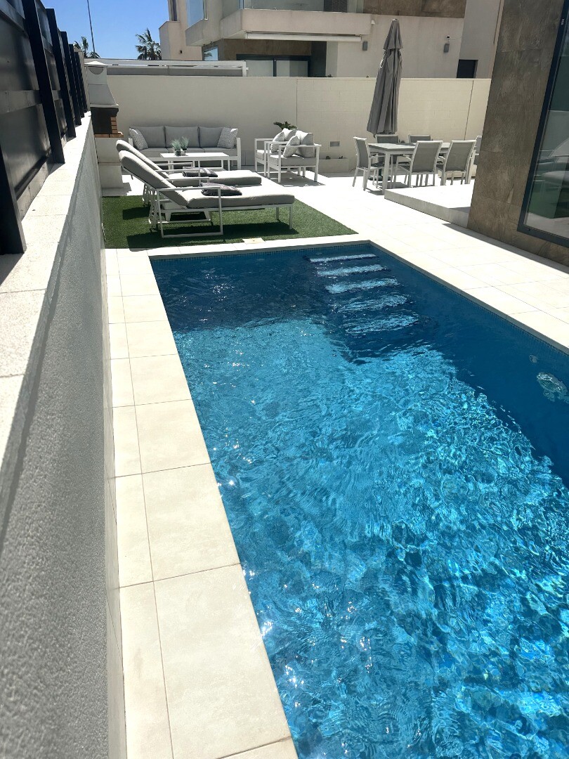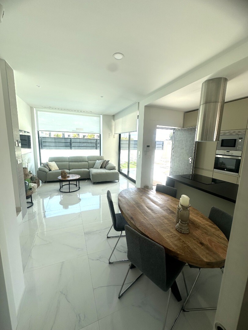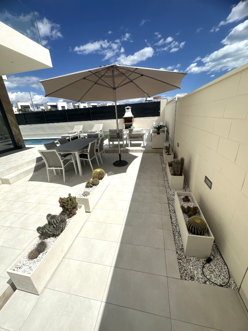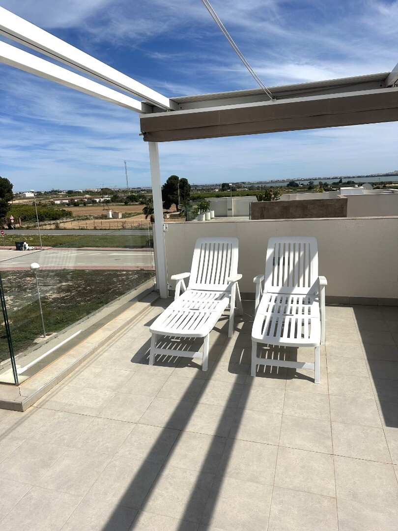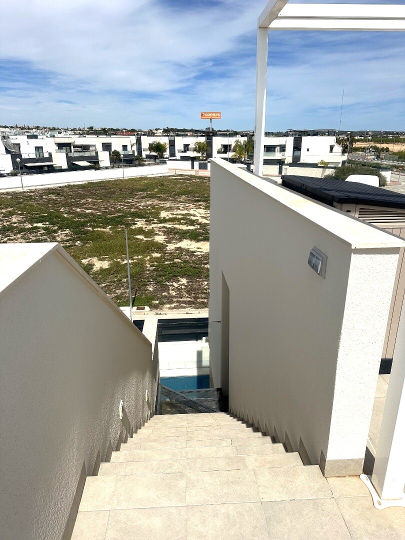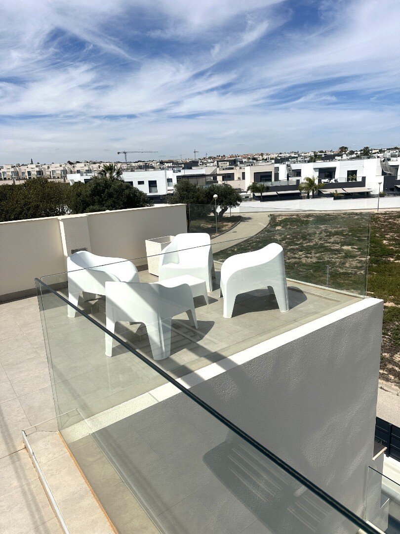 Šiuolaikinio perpardavimo stiliaus „Treze Villas“ 2016 m. su vaizdu į lagūną Ciudad Quesada mieste. Šį kompleksą Rojales sudaro 13 modernių namelių, iš kurių visi yra atskiri įėjimai bendru keliu. Privačiame 115m2 sklype yra privati vieta automobiliui sode. Pirmame aukšte yra šviesi erdvi svetainė su vaizdu į baseiną, atvira virtuvė, miegamasis s...u dvigule lova, vonios kambarys ir dengta terasa. Pirmame aukšte yra didelis miegamasis su vonios kambariu ir drabužine, iš šio miegamojo pateksite į 10m2 terasą. Be to, rasite dvivietį kambarį. Viršutiniame aukšte yra 44m2 soliariumas. Turtas visiškai atnaujintas su tokiais priedais kaip sūraus vandens baseinas, plytelėmis išklotas sodas, aukštos kokybės apšvietimas, buitinių prekių paketas, motorizuotas durų atidarytuvas, centrinis oro kondicionierius, namų automatika, taip pat aeroterminis vandens siurblys energijai iš aplinkinio oro išgauti karštam vandeniui ruošti, šildymui, oro kondicionavimui, grindų šildymui, pavėsinė ant stogo, namas neseniai buvo visiškai nudažytas iš išorės ir tvoros nebebuvo visiškai uždarytos. La Marquesa golfo klubas yra vos už 2 km. Prekybos centras Las Habaneras ir Guardamar paplūdimys yra vos už 10 minučių kelio automobiliu.