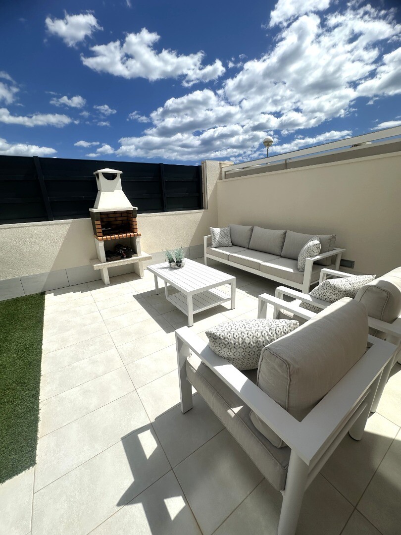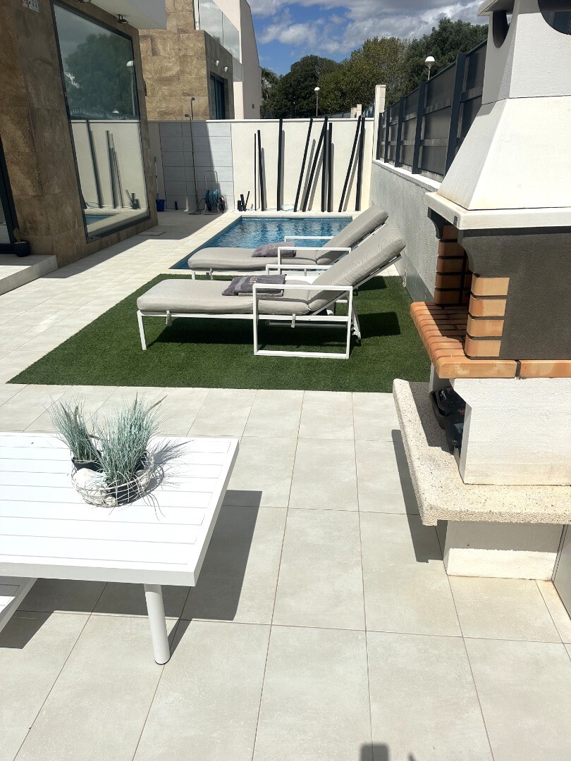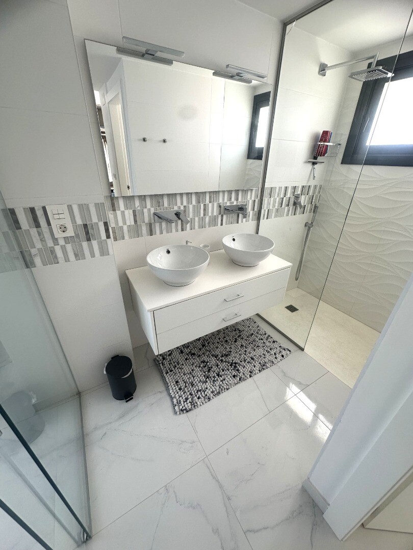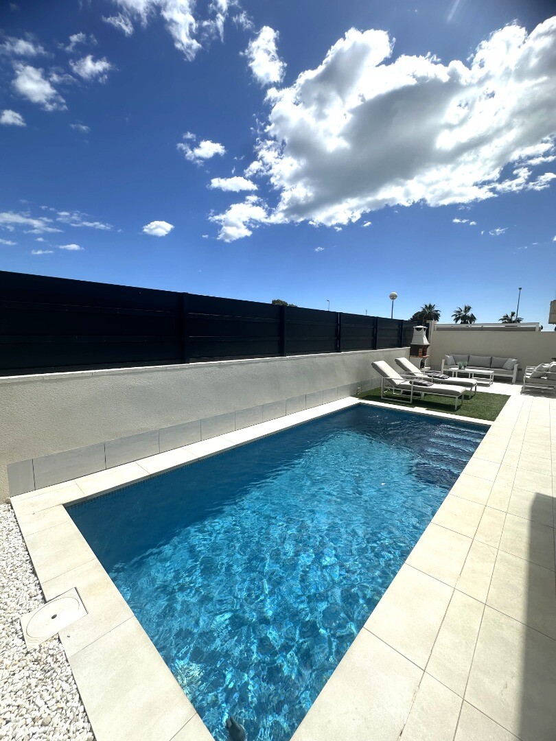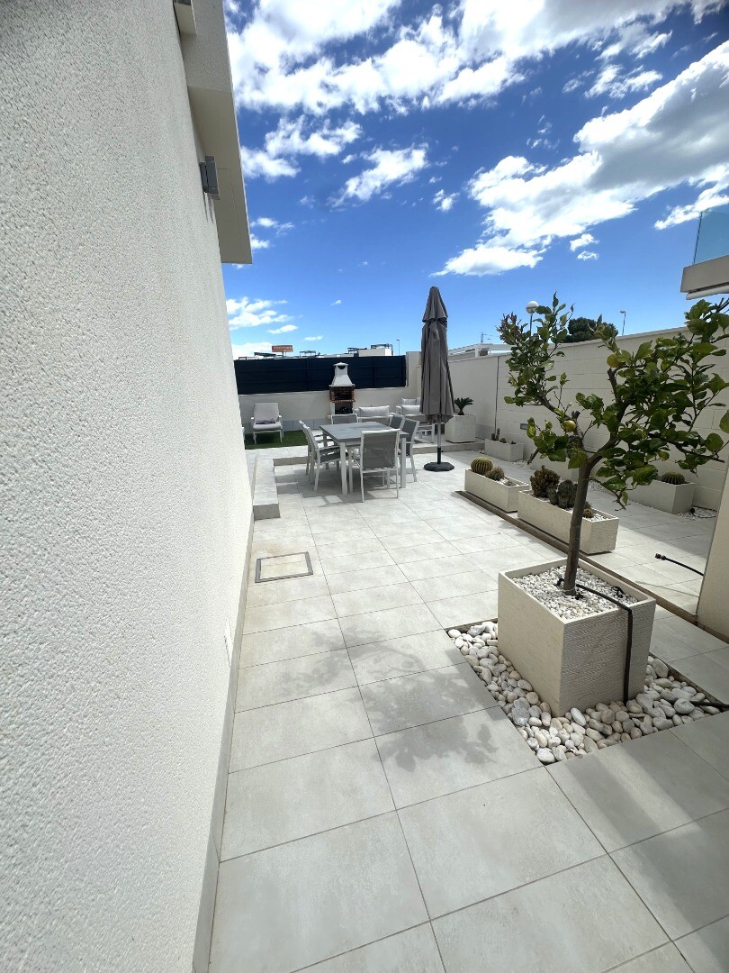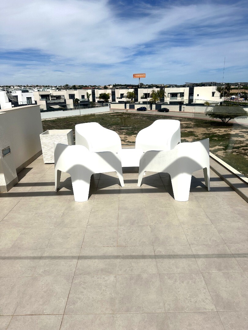 Šiuolaikinio perpardavimo stiliaus „Treze Villas“ 2016 m. su vaizdu į lagūną Ciudad Quesada mieste. Šį kompleksą Rojales sudaro 13 modernių namelių, iš kurių visi yra atskiri įėjimai bendru keliu. Privačiame 115m2 sklype yra privati vieta automobiliui sode. Pirmame aukšte yra šviesi erdvi svetainė su vaizdu į baseiną, atvira virtuvė, miegamasis s...u dvigule lova, vonios kambarys ir dengta terasa. Pirmame aukšte yra didelis miegamasis su vonios kambariu ir drabužine, iš šio miegamojo pateksite į 10m2 terasą. Be to, rasite dvivietį kambarį. Viršutiniame aukšte yra 44m2 soliariumas. Turtas visiškai atnaujintas su tokiais priedais kaip sūraus vandens baseinas, plytelėmis išklotas sodas, aukštos kokybės apšvietimas, buitinių prekių paketas, motorizuotas durų atidarytuvas, centrinis oro kondicionierius, namų automatika, taip pat aeroterminis vandens siurblys energijai iš aplinkinio oro išgauti karštam vandeniui ruošti, šildymui, oro kondicionavimui, grindų šildymui, pavėsinė ant stogo, namas neseniai buvo visiškai nudažytas iš išorės ir tvoros nebebuvo visiškai uždarytos. La Marquesa golfo klubas yra vos už 2 km. Prekybos centras Las Habaneras ir Guardamar paplūdimys yra vos už 10 minučių kelio automobiliu.
