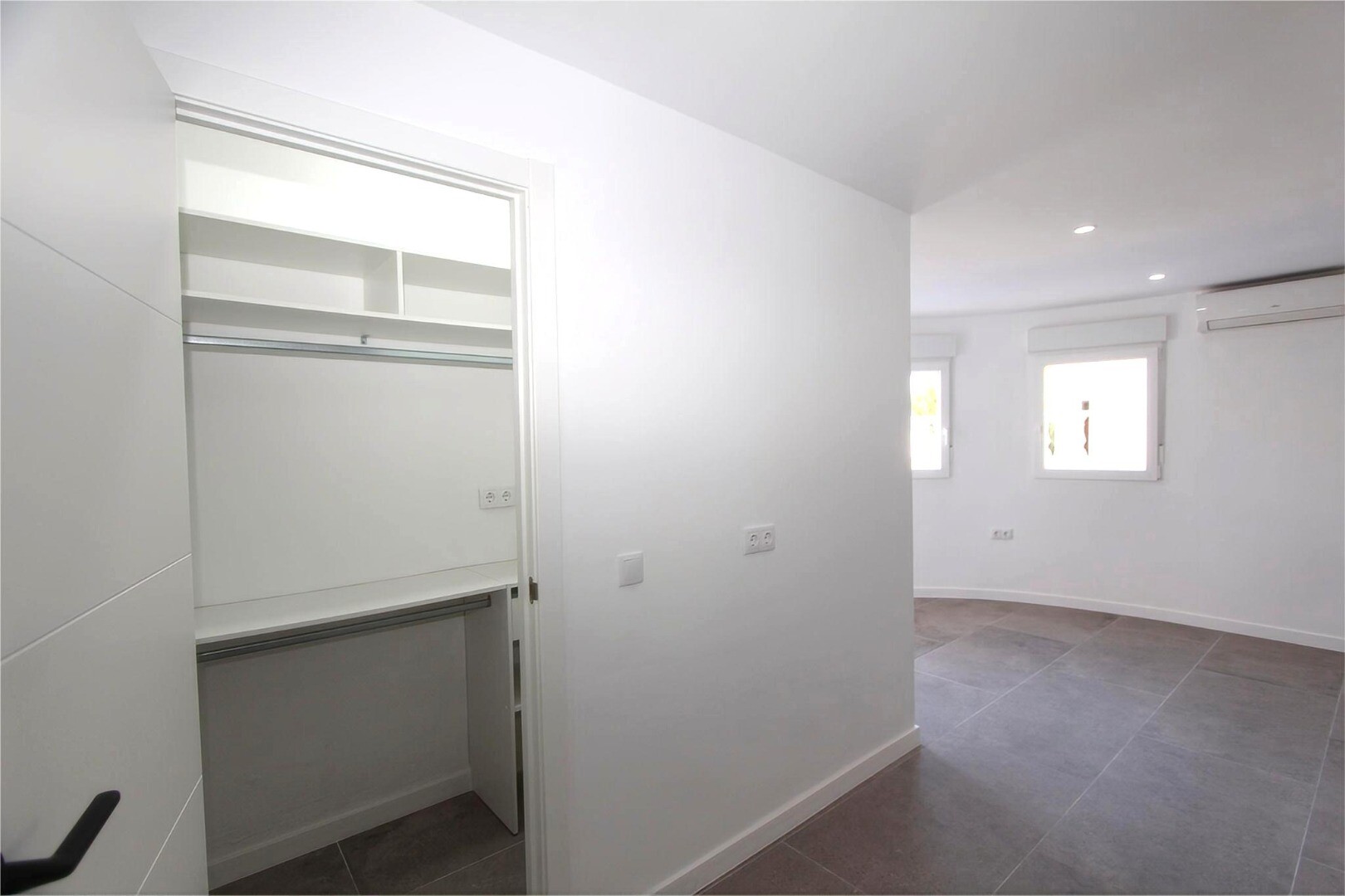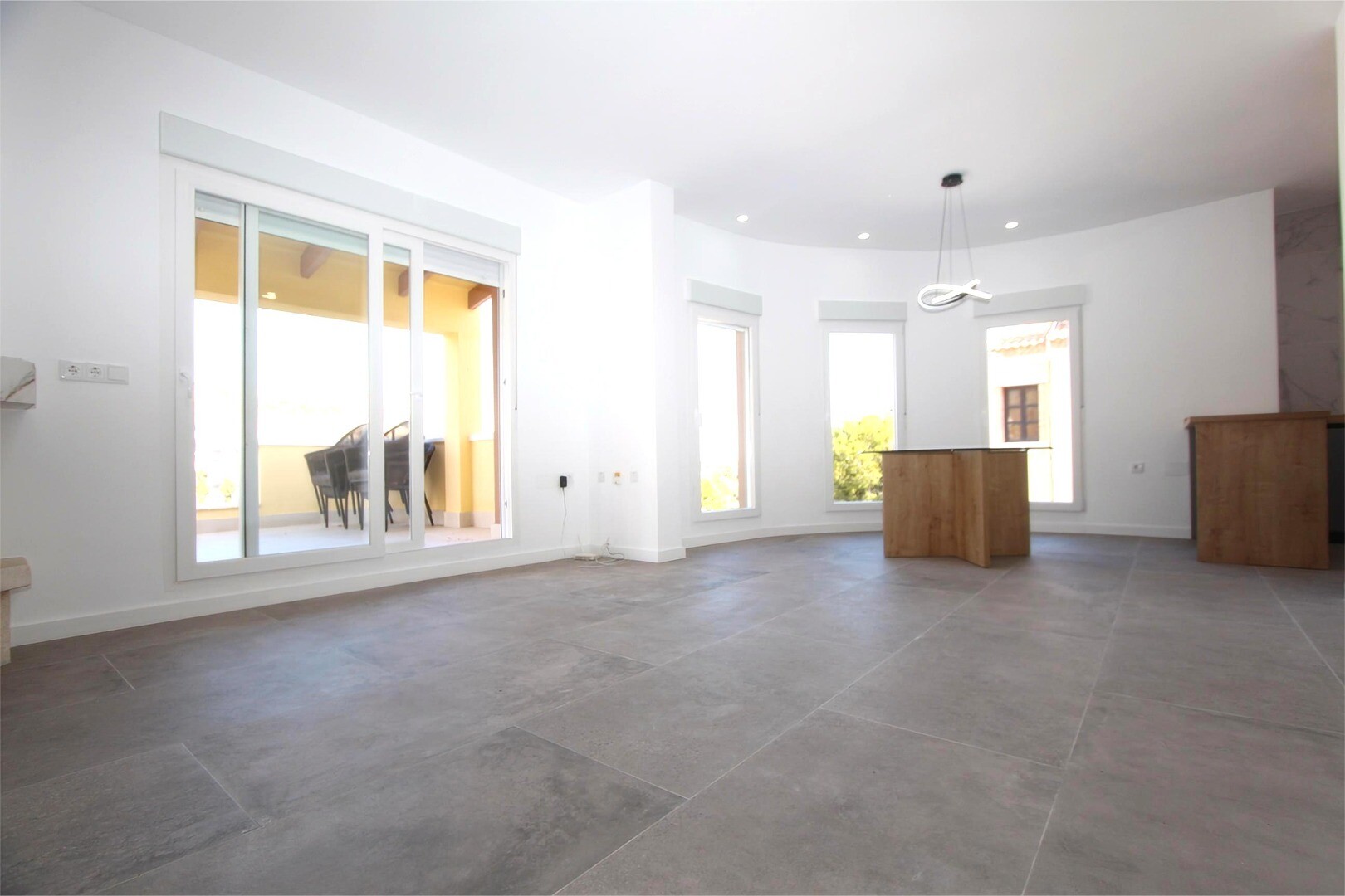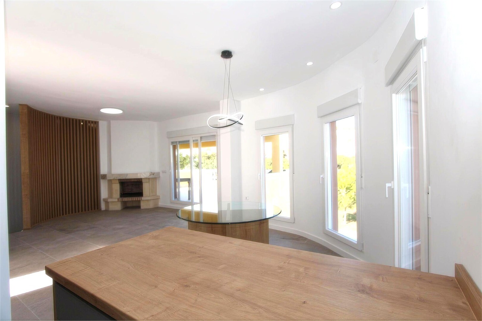 Įėjus į gyvenamąją patalpą, pirmiausia sutinkame erdvų ir šviesų svetainės-valgomojo kambarį su didžiuliais langais ir prieiga prie erdvios dalinai uždengtos terasos, iš kurios atsiveria puikūs vaizdai ir užtikrintas visiškas privatumas.Virtuvė, atviru stiliumi, pilnai įrengta aukštos ir žemos spintelės bei kokybiški buitiniai prietaisai. Ji puikia...i dera su valgomojo zona, kur išsiskiria jauki židinys, suteikiantis šilumos atmosferai.Šiame aukšte taip pat yra praktiška spinta ir svečių tualetas.Poilsio zona yra žemesniame aukšte, į kurį patenkama patogiais laiptais. Čia randame pilno dydžio vonios kambarį, svečių kambarį, dar vieną kambarį su vonios kambariu ir pagrindinį miegamąjį, erdvų ir elegantišką, su savo vonios kambariu ir drabužine.Kiekvienas miegamasis turi tiesioginę prieigą prie žemesniųjų terasų, kur yra privatus baseinas – puiki vieta atsipalaiduoti.