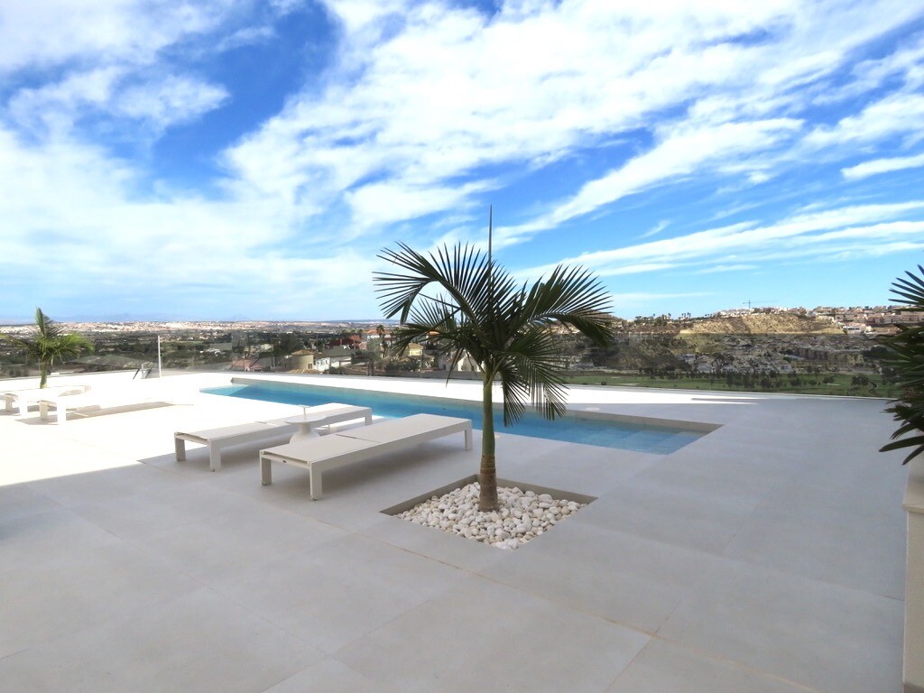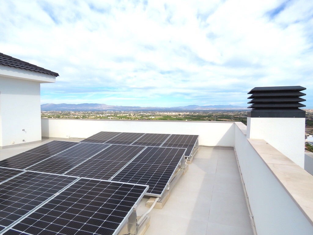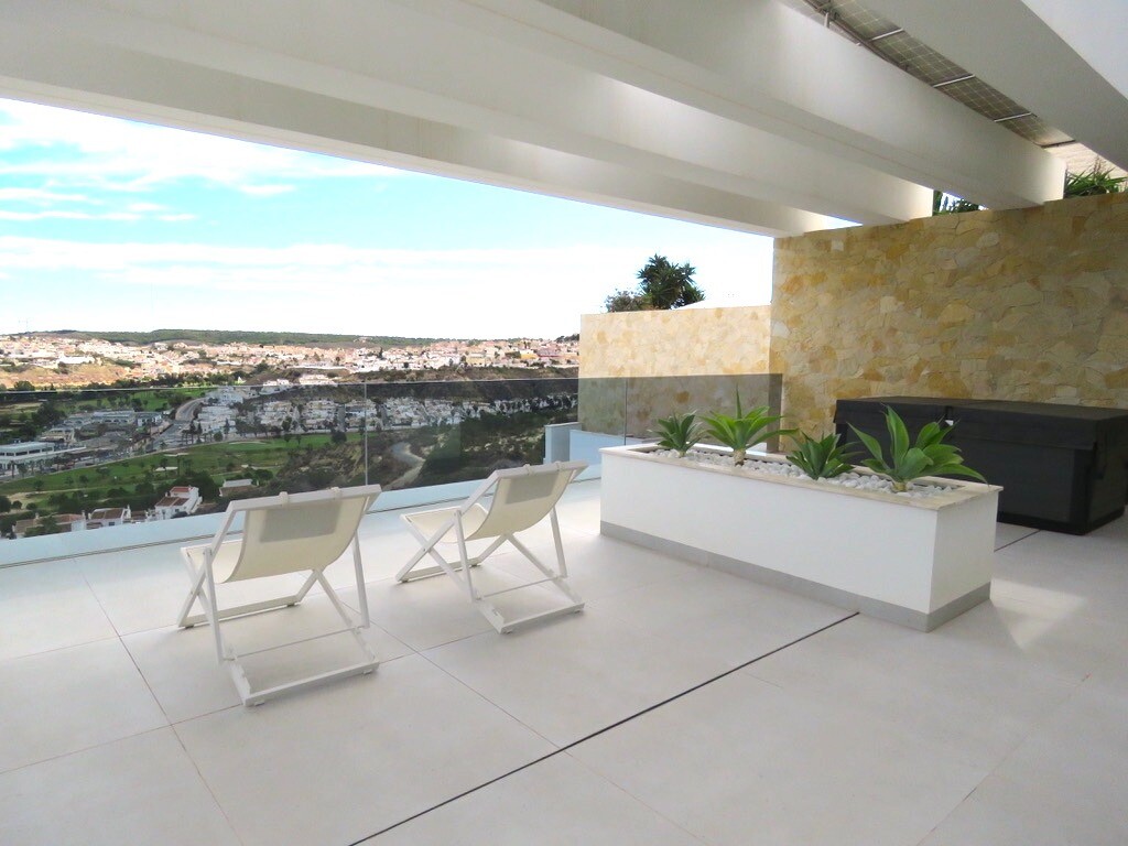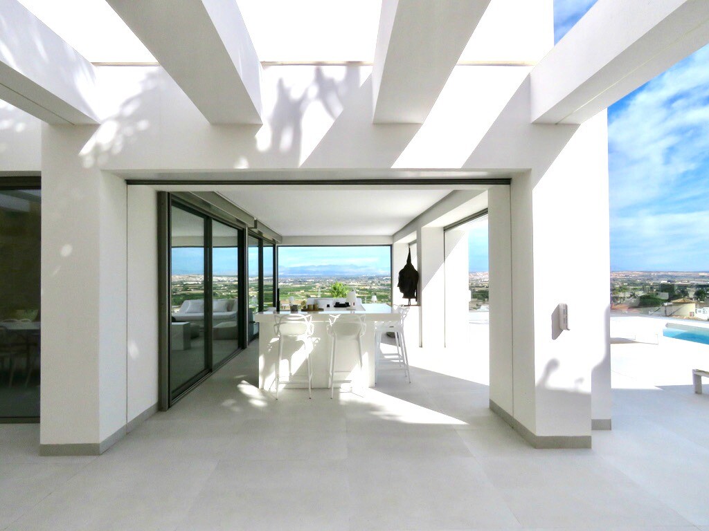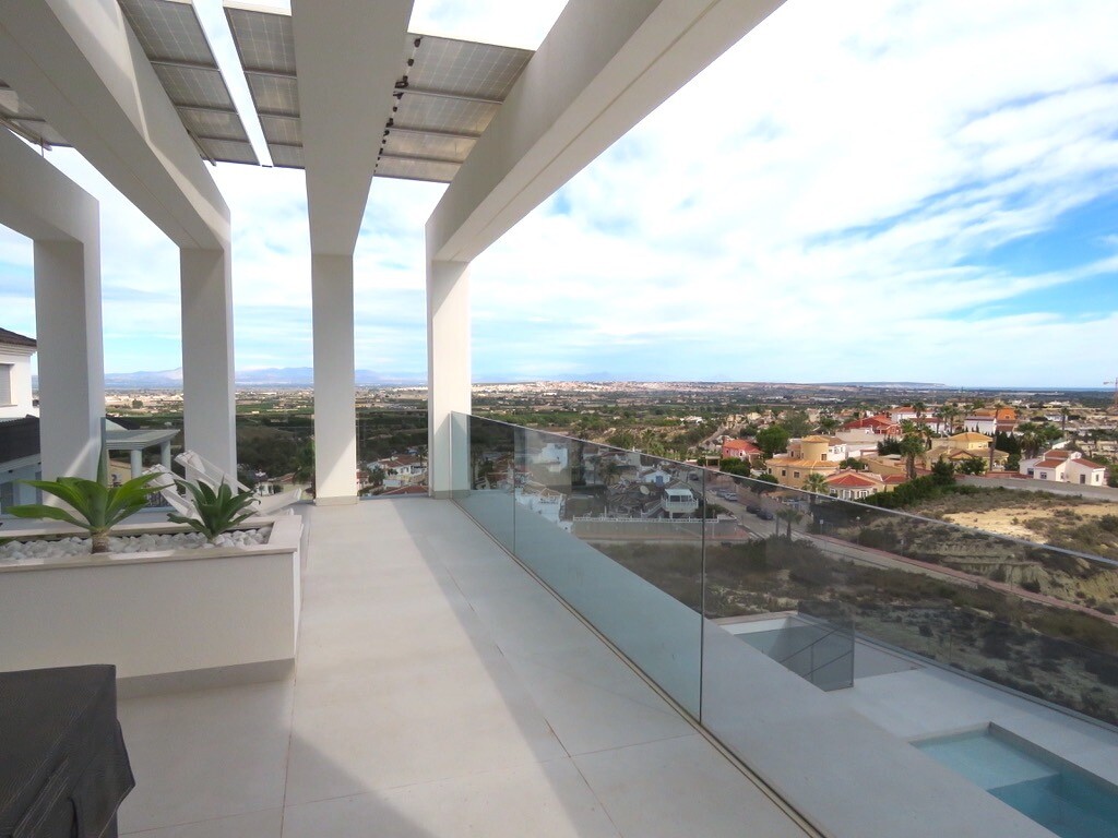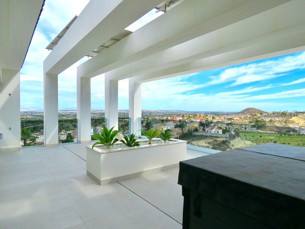 Soliariumas 66m2. Šioje dizaino viloje įrengtos naujausios technologijos, o visos medžiagos buvo kruopščiai parinktos. Pirmame aukšte yra svetainė ir valgomasis su virtuve, namų apyvokos kambarys ir dengta terasa. Pirmame aukšte yra 3 miegamieji ir 3 vonios kambariai. Garažo lygyje, žinoma, yra garažas, kuriame telpa 8 automobiliai, pramogų kambary...s ir 4 miegamasis bei vonios kambarys. Visuose namo aukštuose yra šildomos grindys, o name taip pat yra pilnas oro kondicionierius. Liftas pakelia iš garažo į viršutinį namo aukštą. Šioje gražioje viloje taip pat yra saulės baterijų. Šioje viloje yra baseinas 12x2m, lauko dušas su tualetu ir kriaukle. Prekybos centras su „La Marquesa Golf“ klubu yra vos už 900 metrų nuo šios vilos. Alikantės oro uostas yra pasiekiamas per 30 minučių.