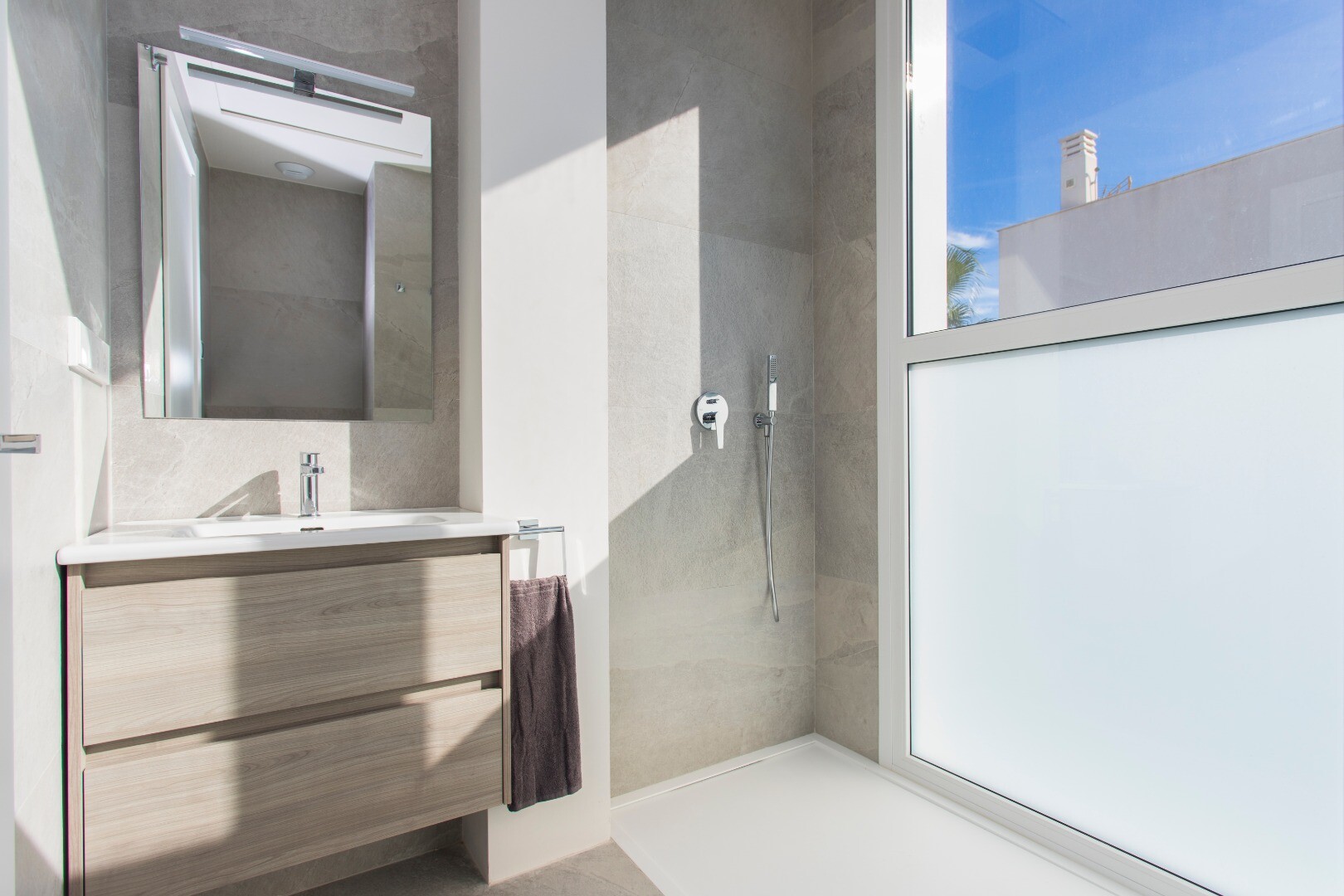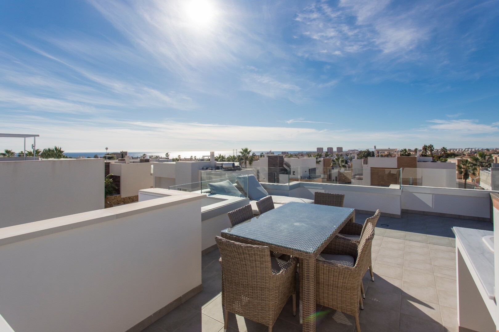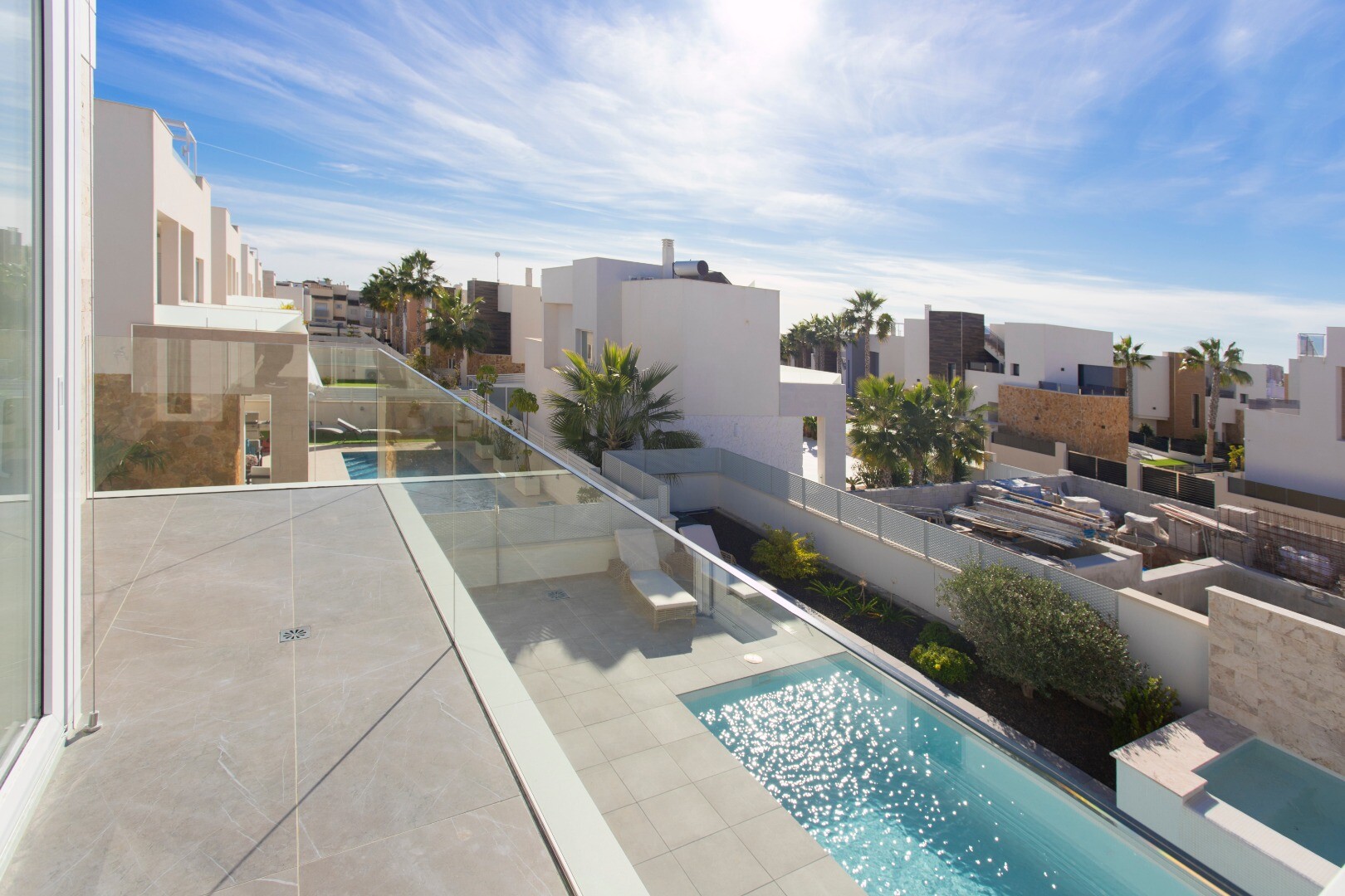 2 vilos, esančios Aguas Nuevas rajone (Torrevieja), 150 kvadratinių metrų, padalytos į 3 miegamuosius, 2 vonios kambarius ir didelę svetainę / virtuvę. Sklypai yra 300 kvadratinių metrų. Iš svetainės atsiveria vaizdas į baseiną su įmontuota sūkurine vonia ir kriokliu. Stogo terasoje didelis soliariumas su kepsnine.