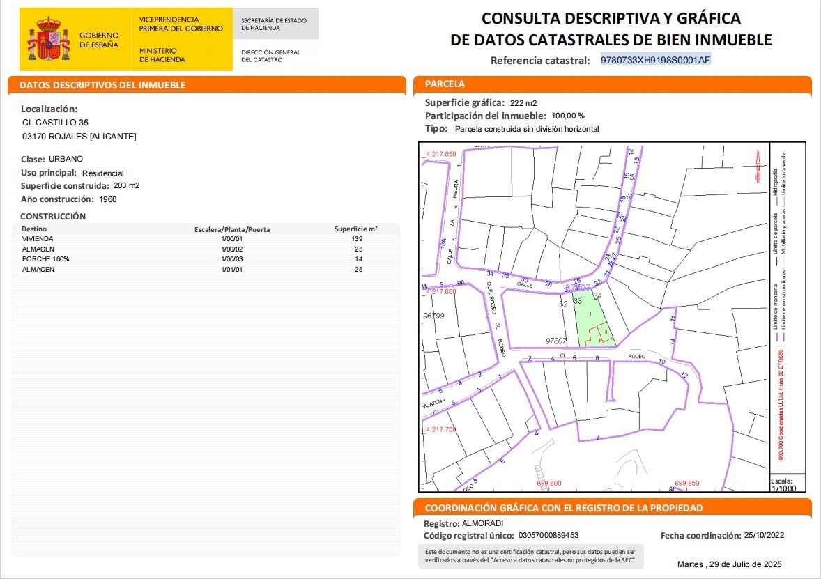 Puiki proga Rojales senamiesčio centre. Parduodamas 222 m² ploto miesto sklypas (pagal kadastro duomenis) su fasadu į dvi gatves, idealus jūsų svajonių namų statybai arba investicijai į projektą su dideliu potencialu. Šiuo metu sklype yra pusiau renovuotas pastatas, todėl galite tęsti esamus darbus arba nugriauti ir pradėti nuo nulio, priklausomai ...nuo savo vizijos ir poreikių. Sklypas yra įsikūręs žavingoje, ramioje vietoje, vos kelios minutės pėsčiomis nuo visų paslaugų: prekybos centrų, restoranų, vaistinių, bankų, viešojo transporto, mokyklų ir kt. Vos 10 minučių kelio iki Guardamar paplūdimių ir 35 minutės iki Alikantės oro uosto. Susisiekite su mumis, kad susitartume dėl apžiūros ir atrastumėte visą šio nekilnojamojo turto potencialą!